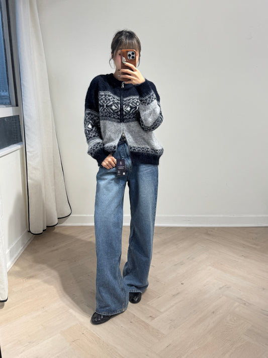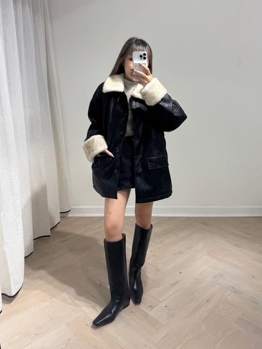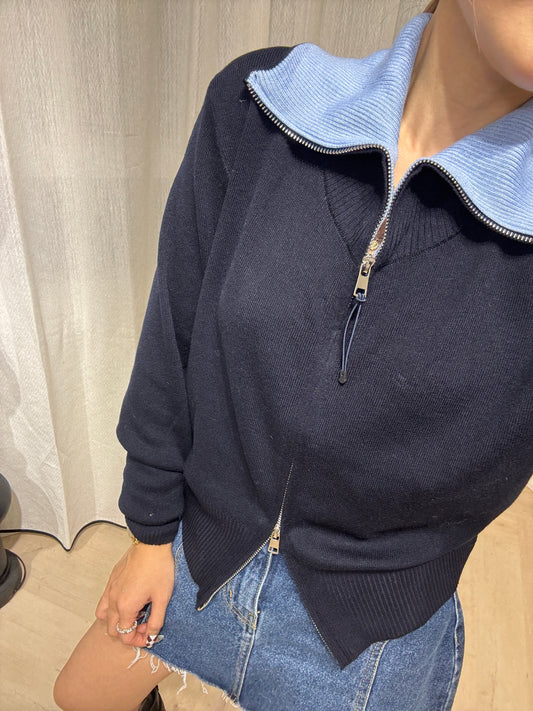 併色反領拉鍊上衣外套 ( 米白/深藍 )