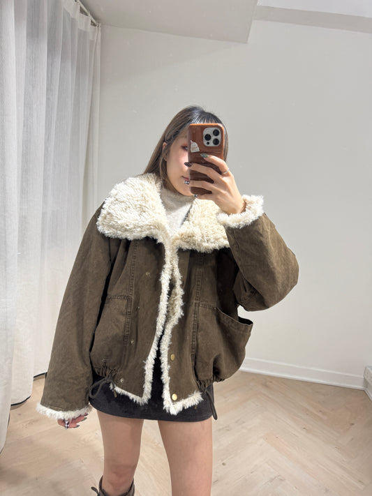 大反領毛毛洗水外套 ( 灰綠/啡 )