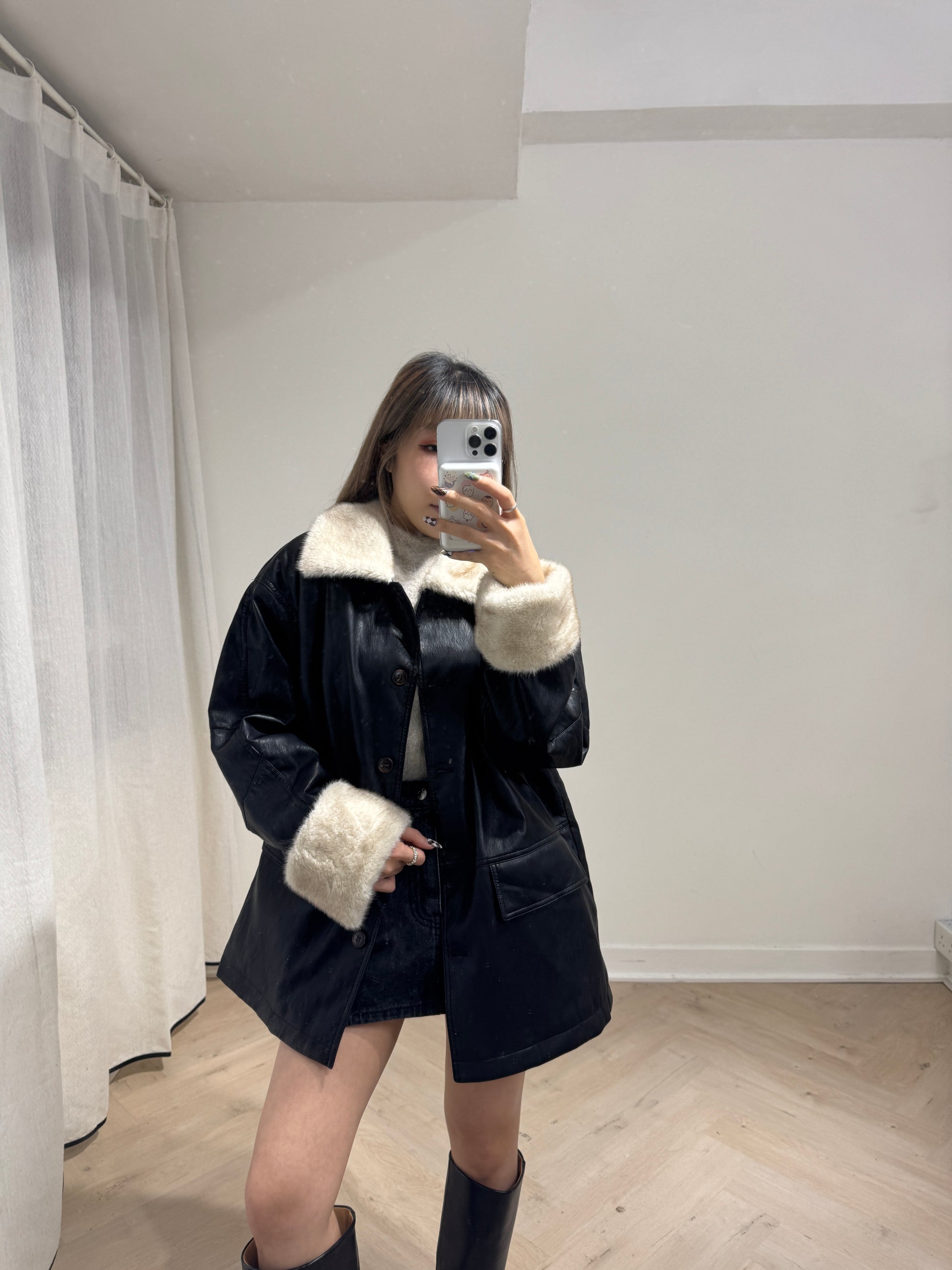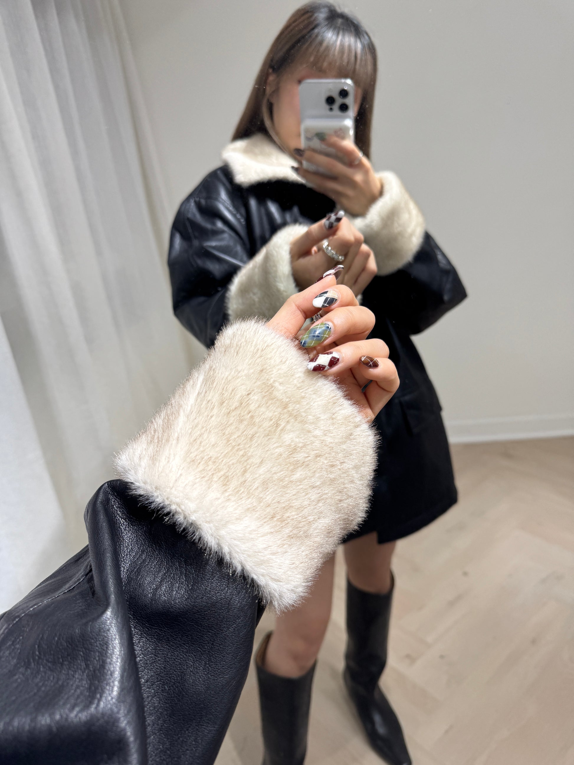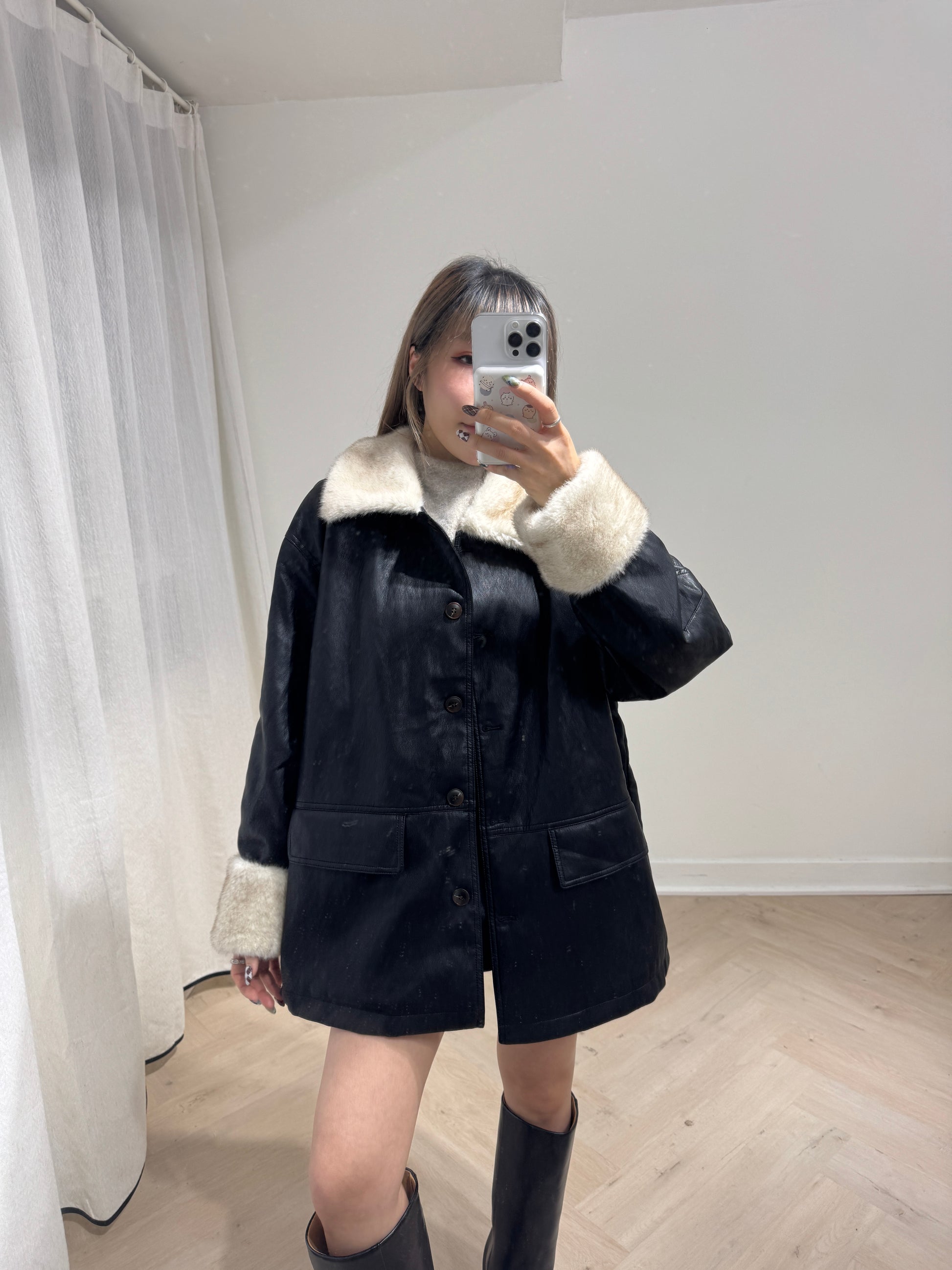 併毛毛黑色仿皮外套
