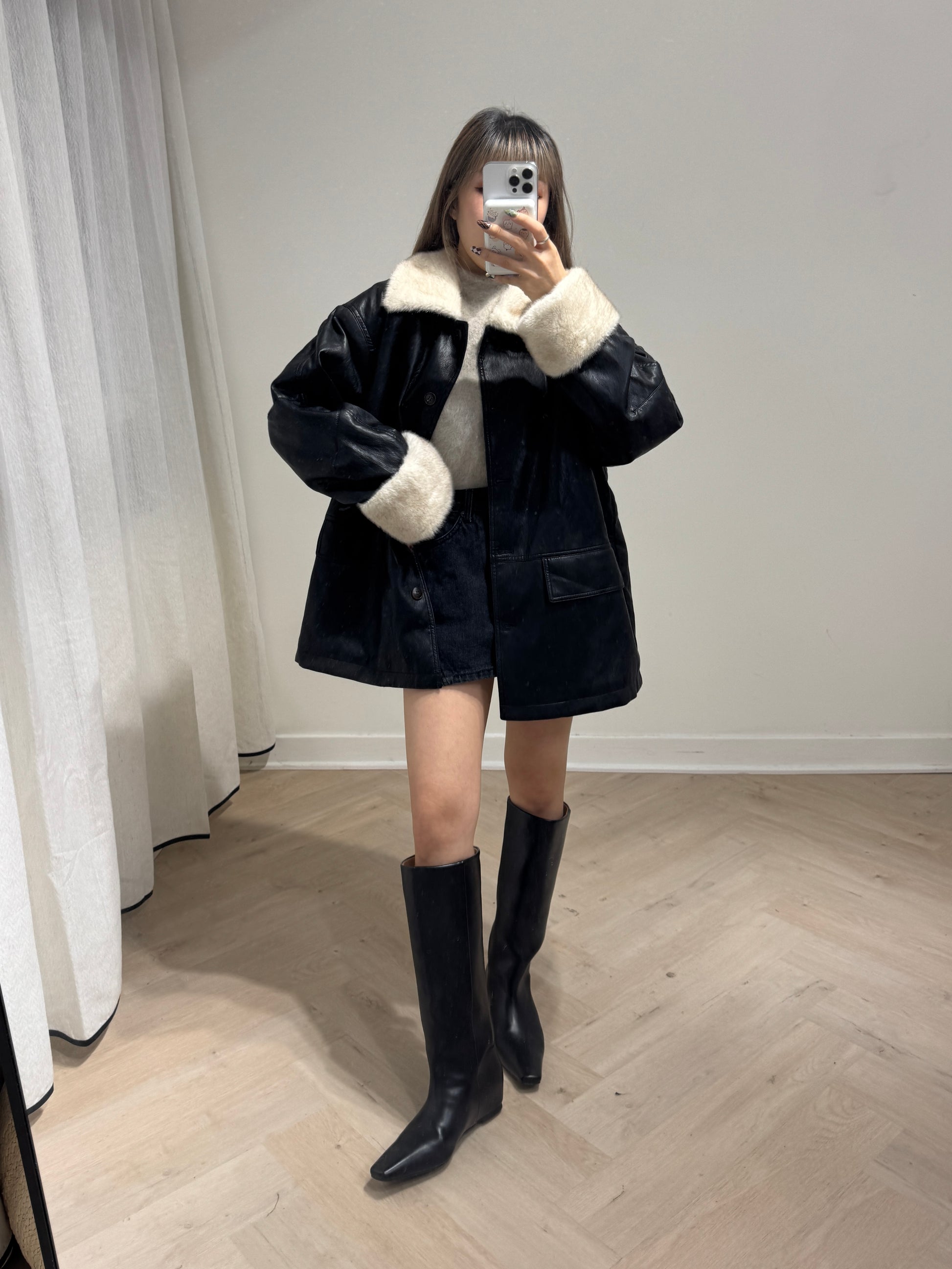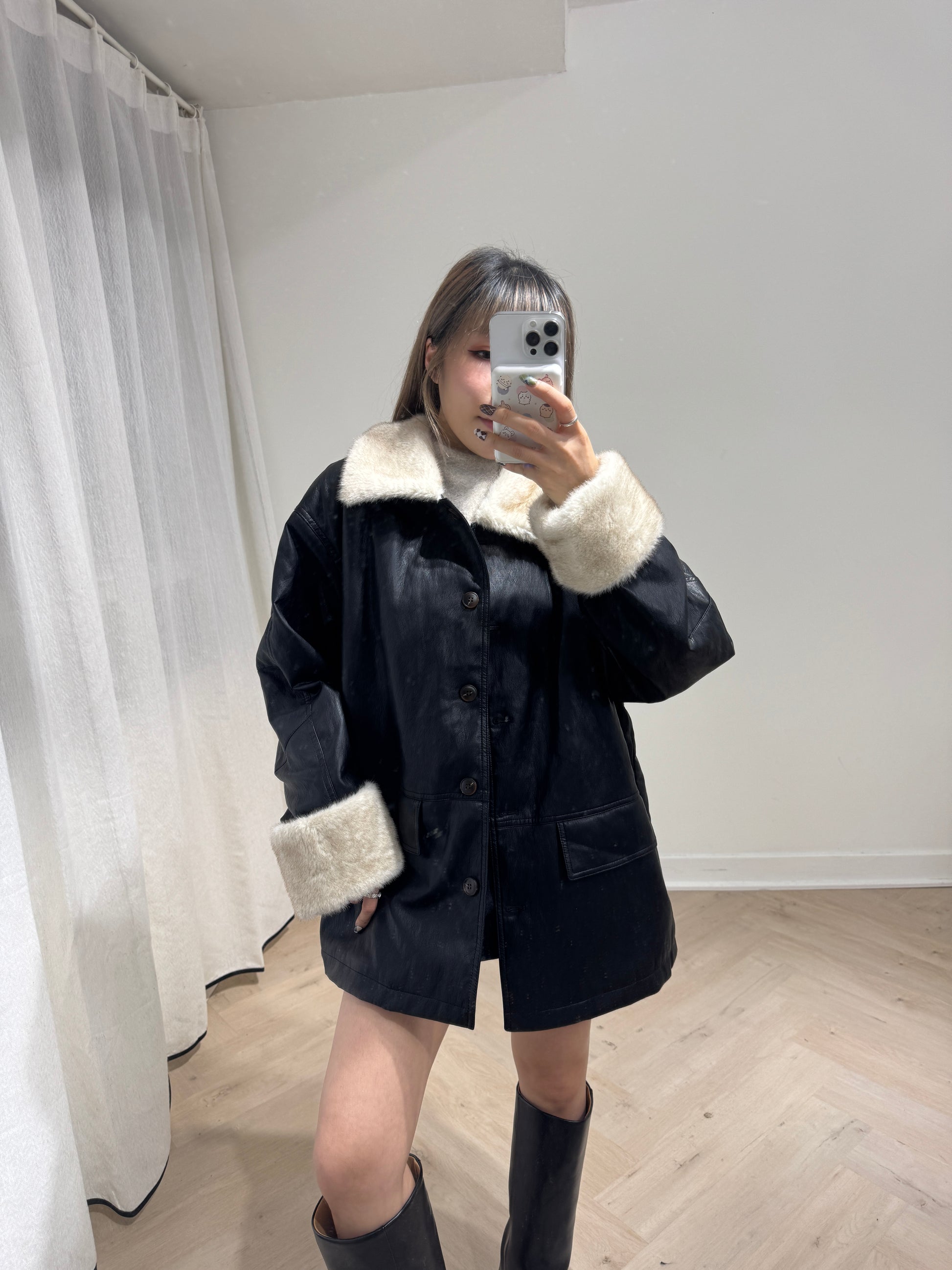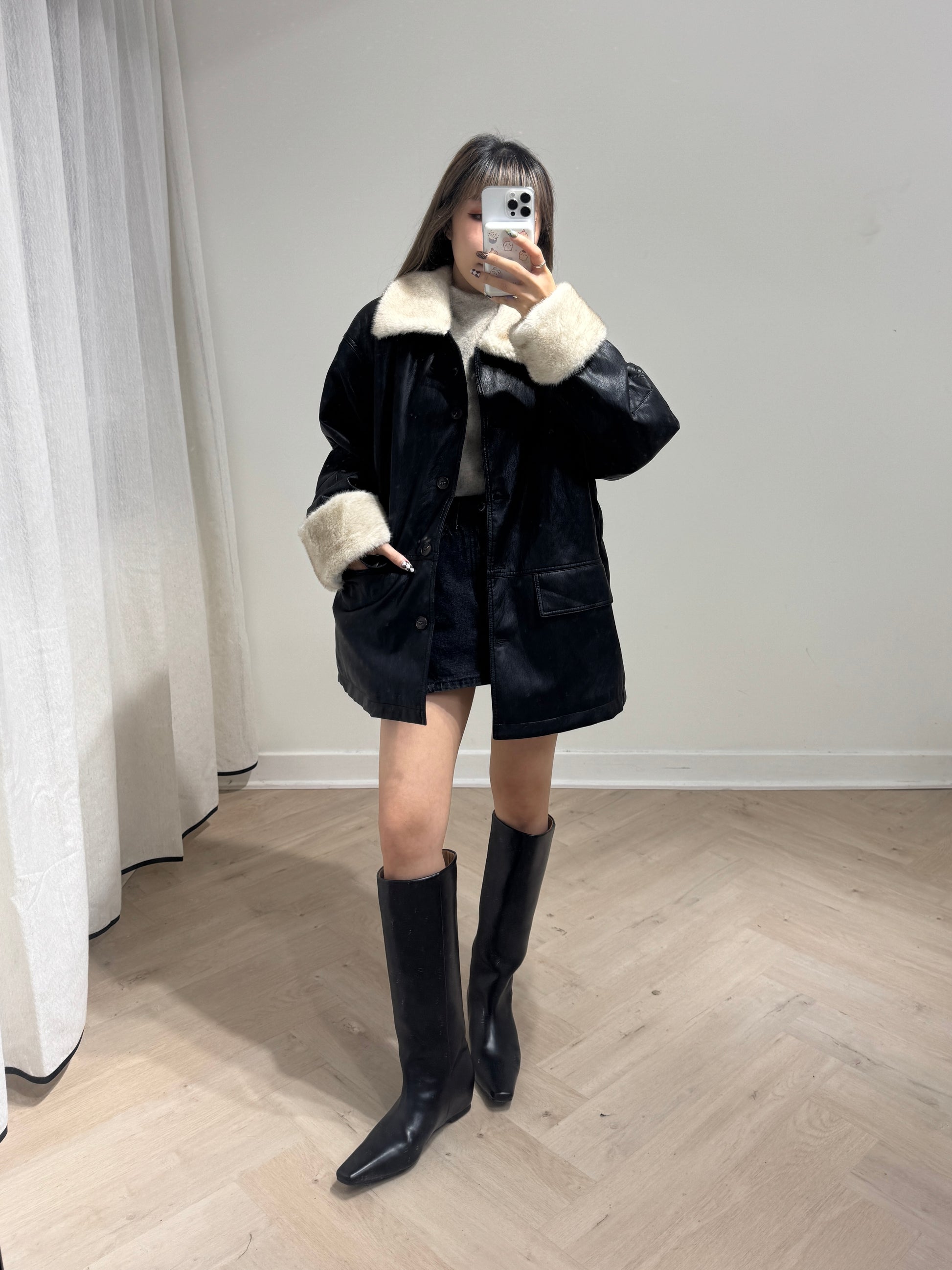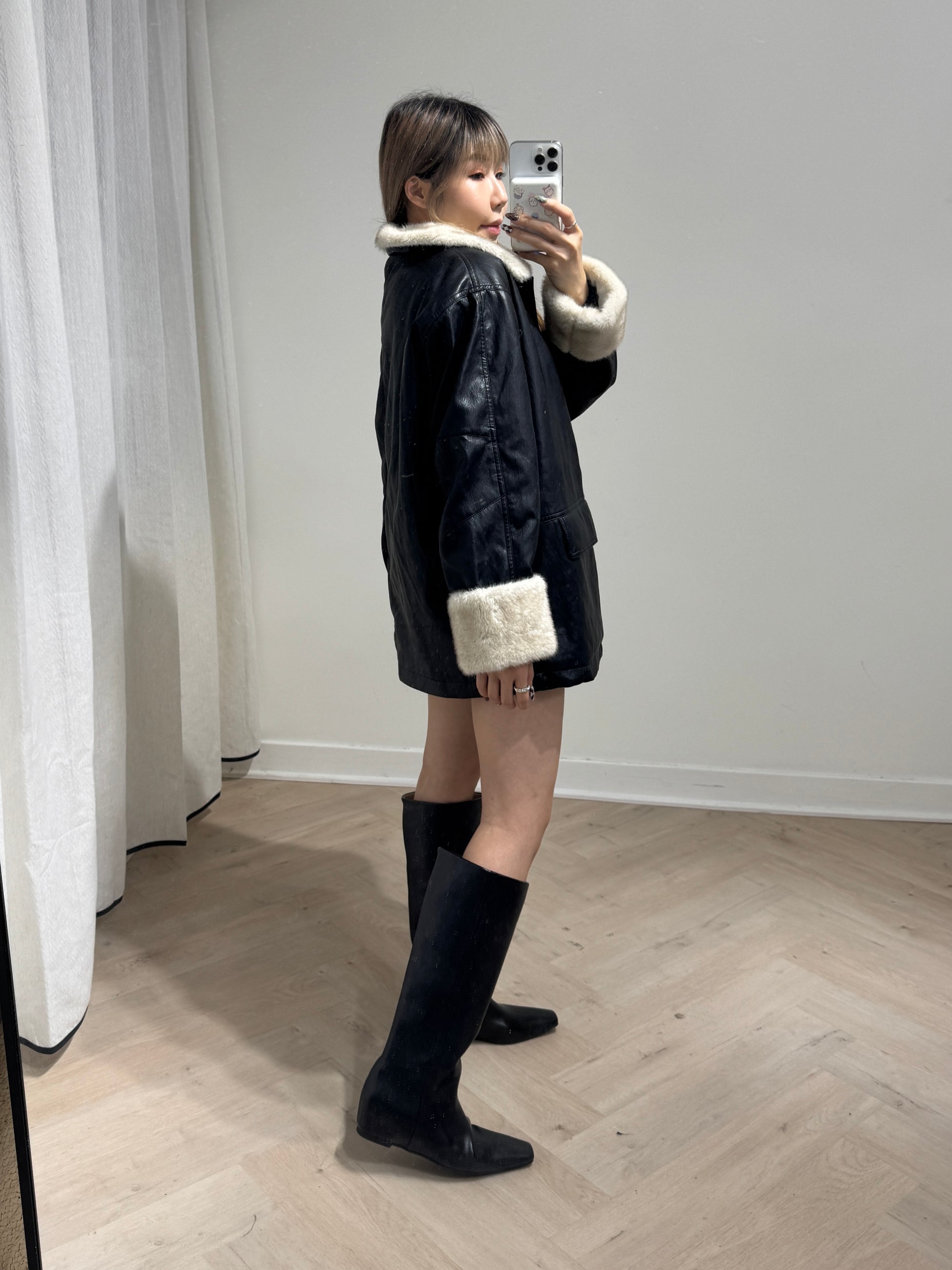 併毛毛黑色仿皮外套