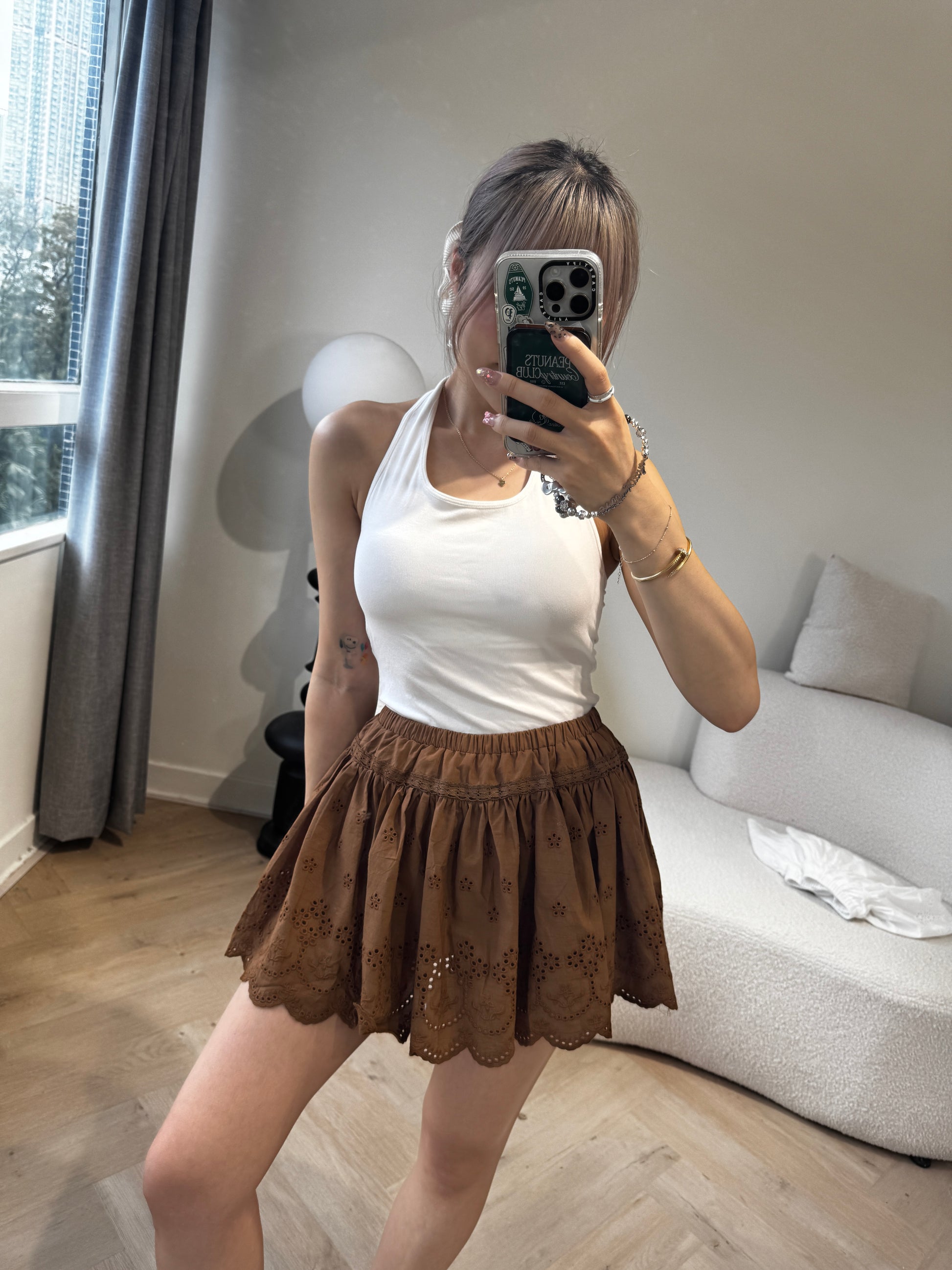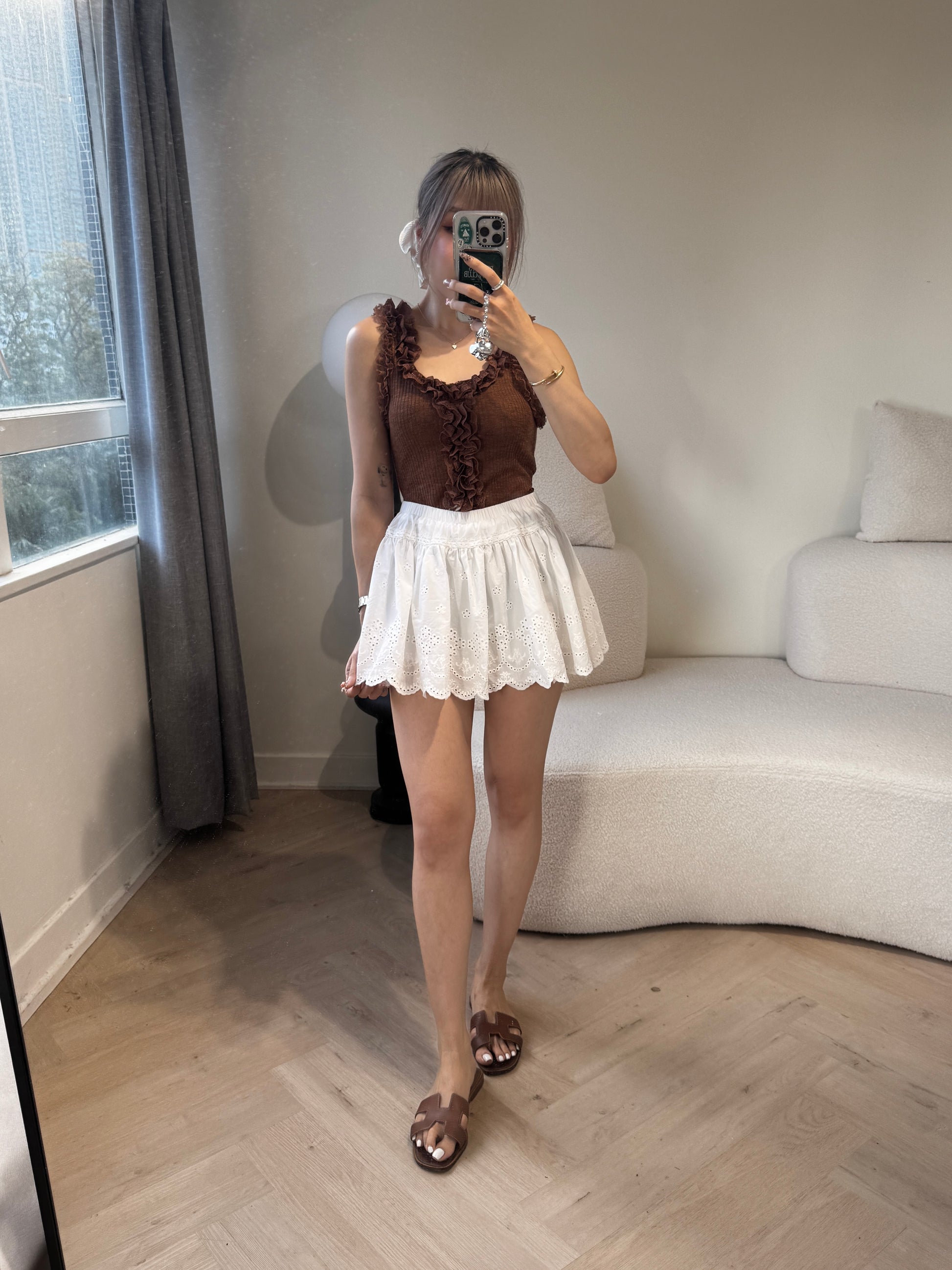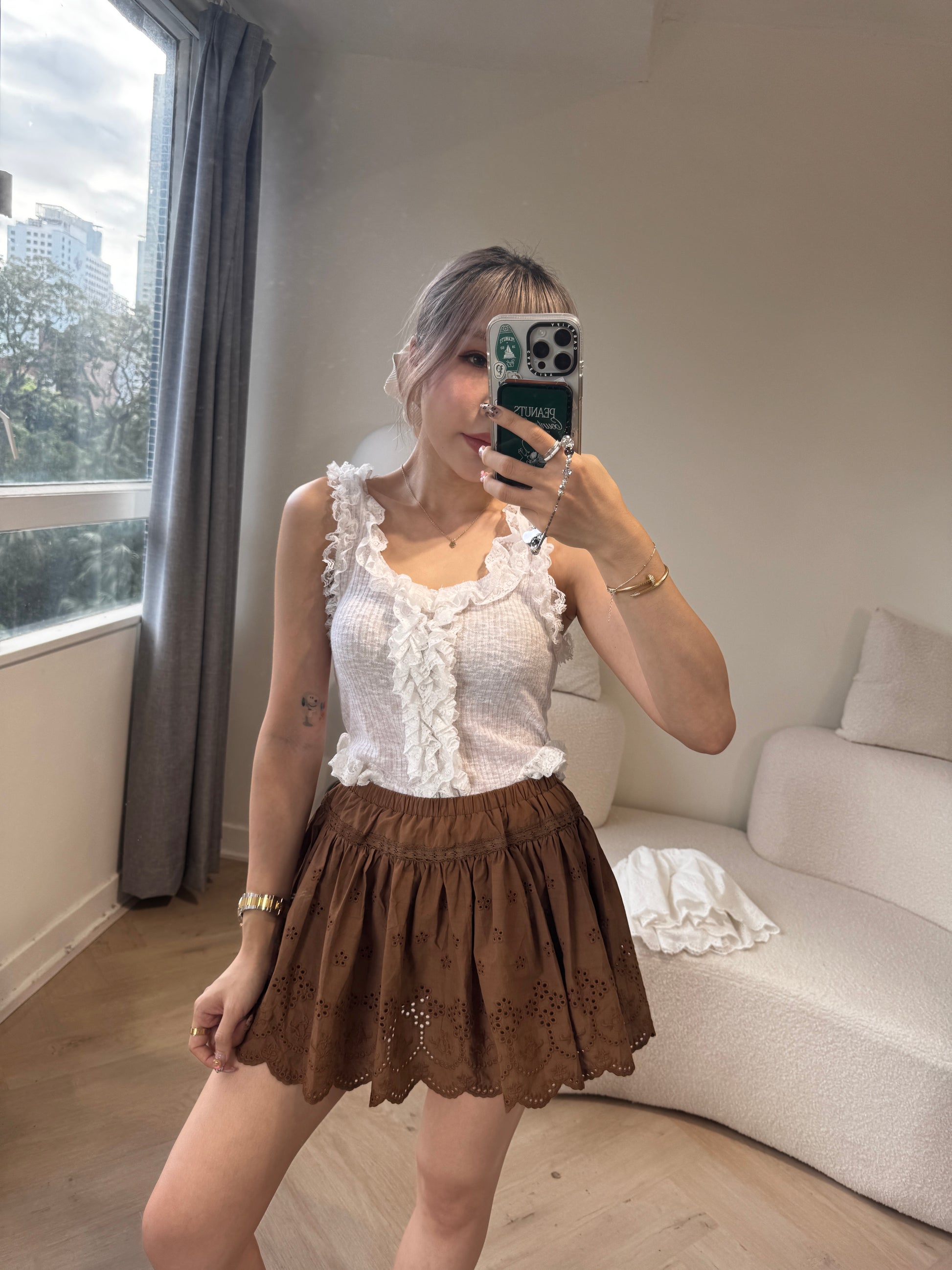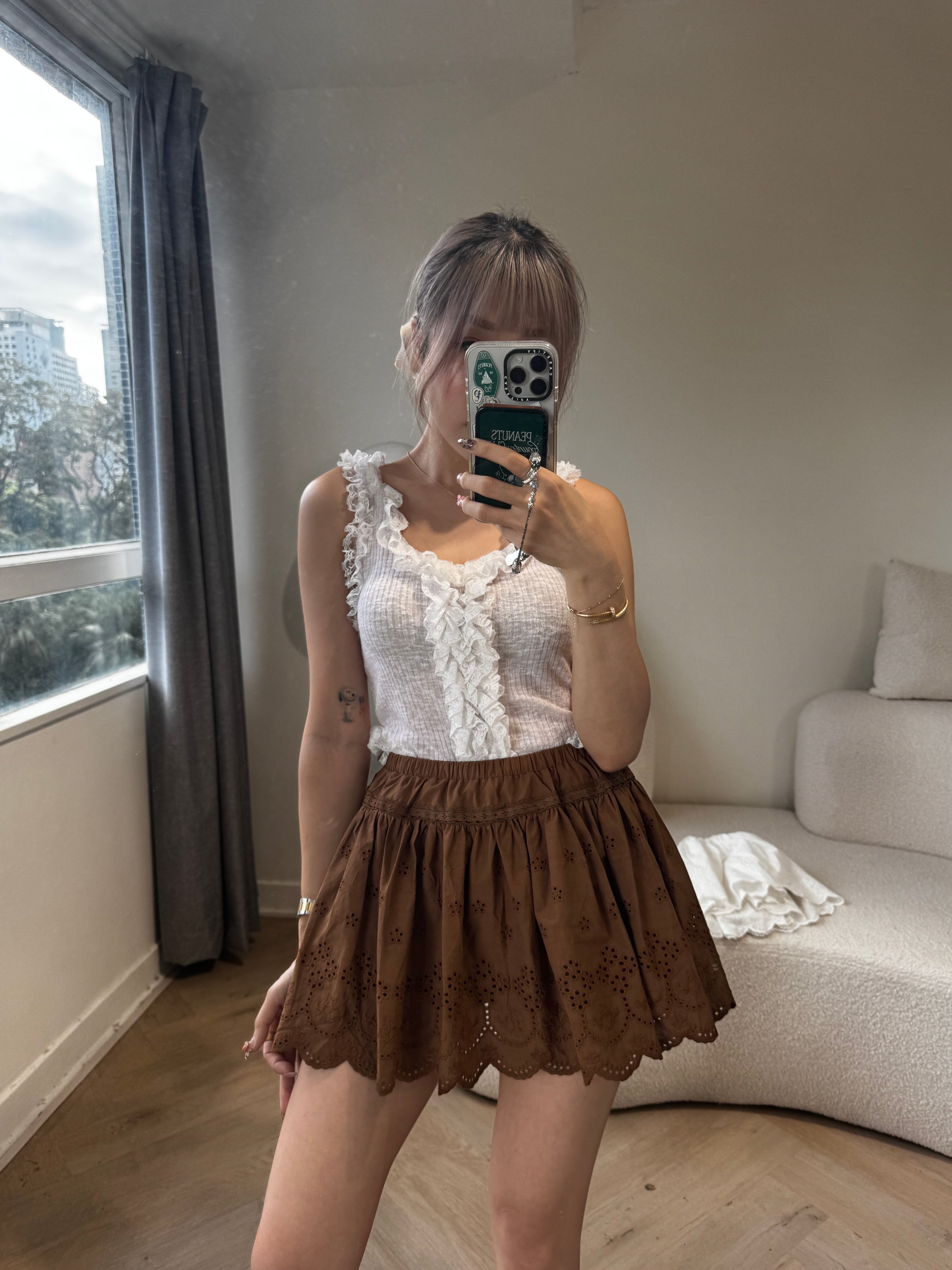 勾花波浪邊短裙 ( 白/啡 )