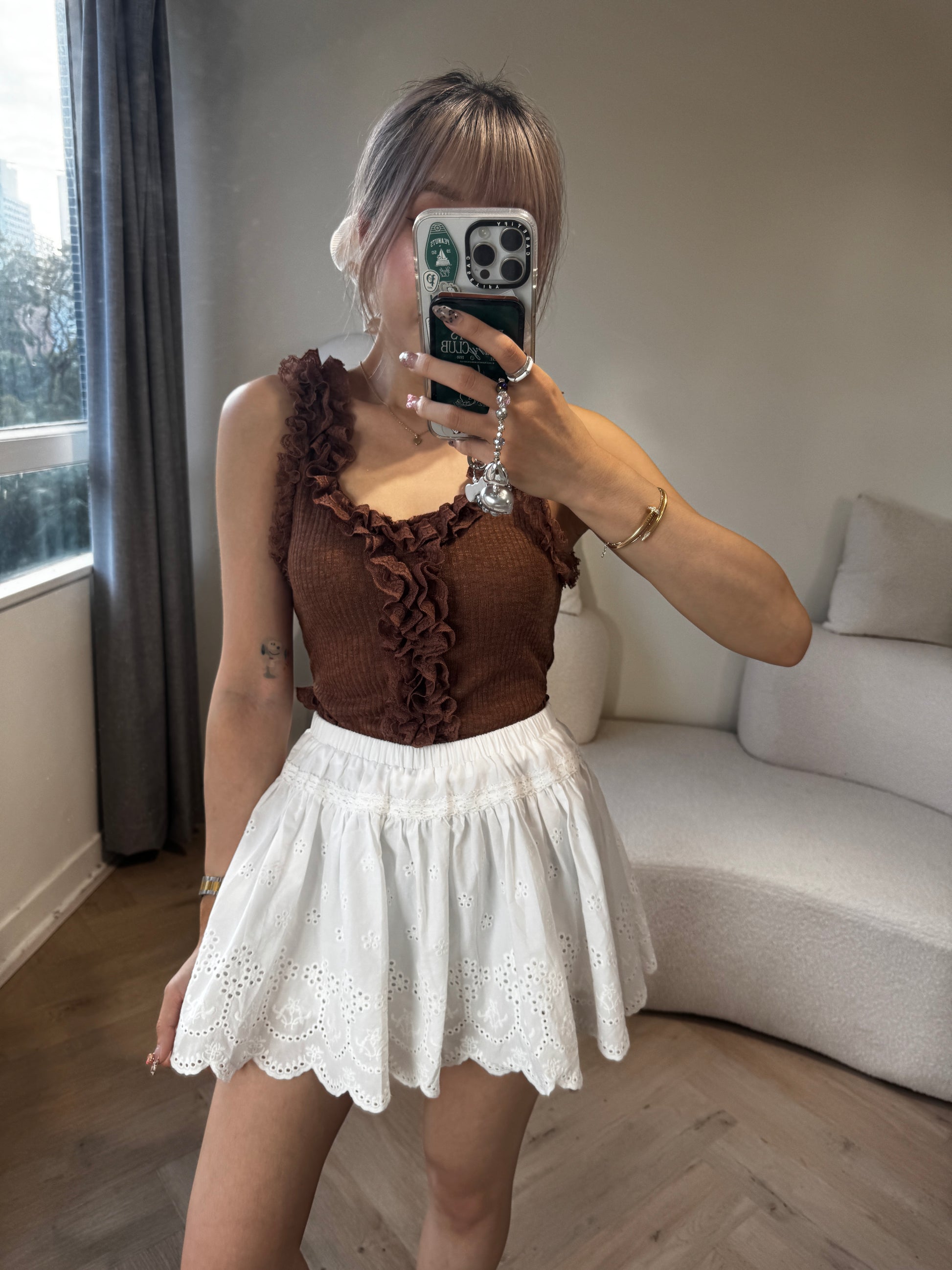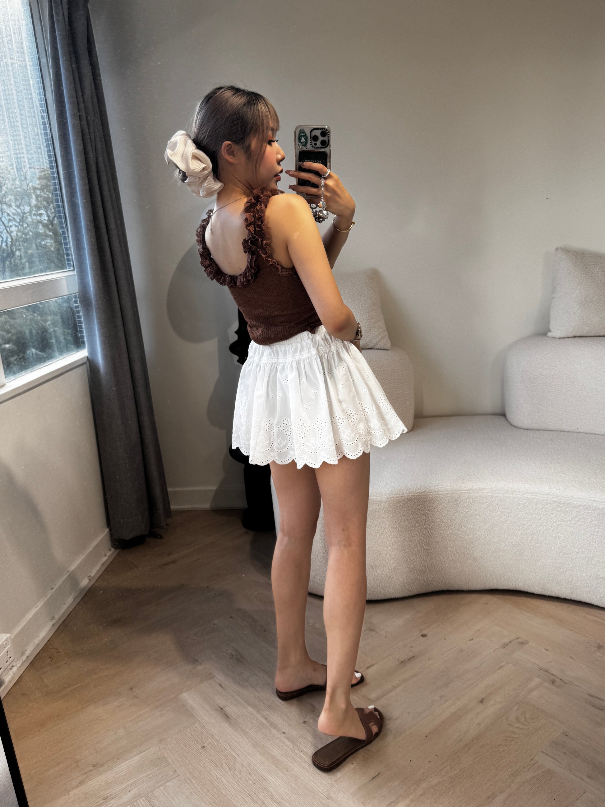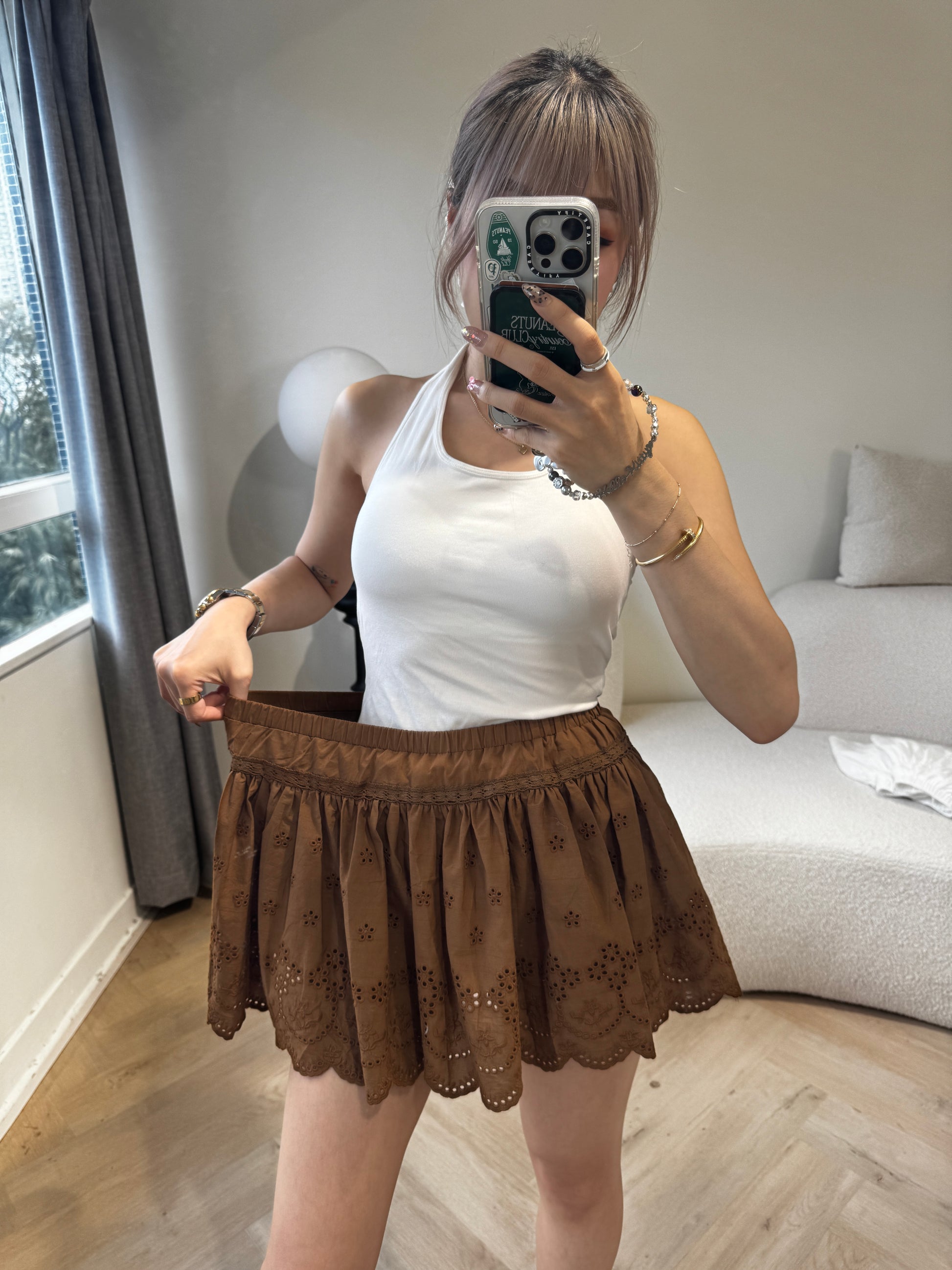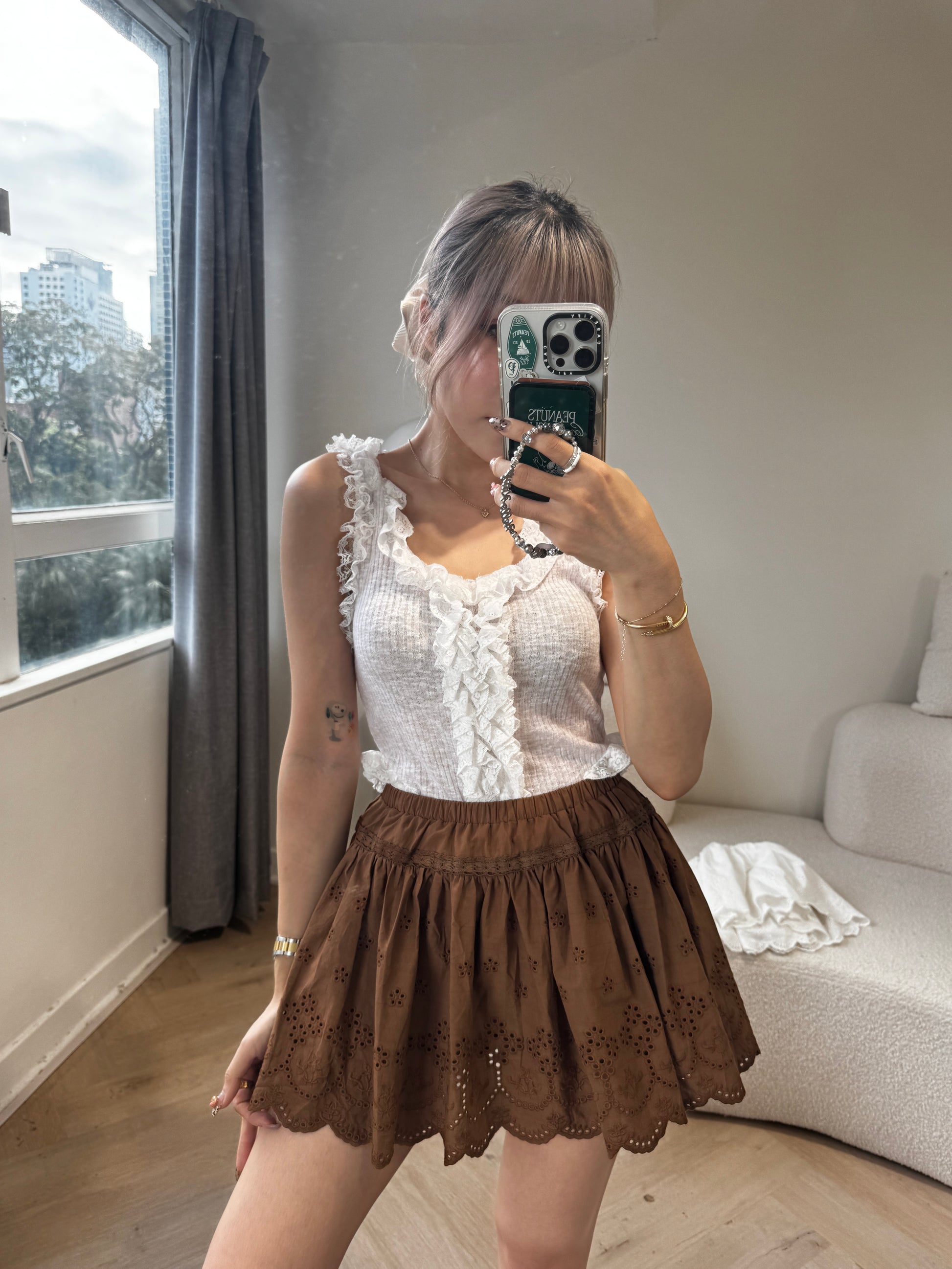 勾花波浪邊短裙 ( 白/啡 )