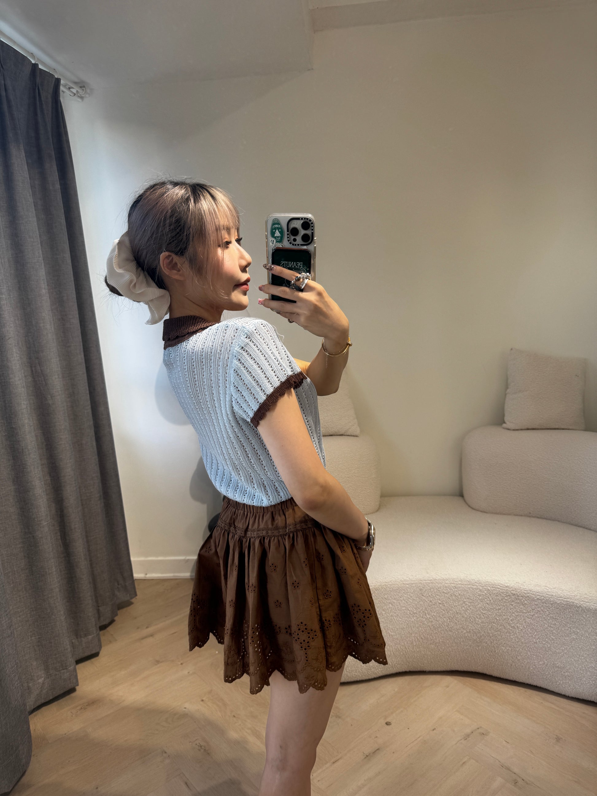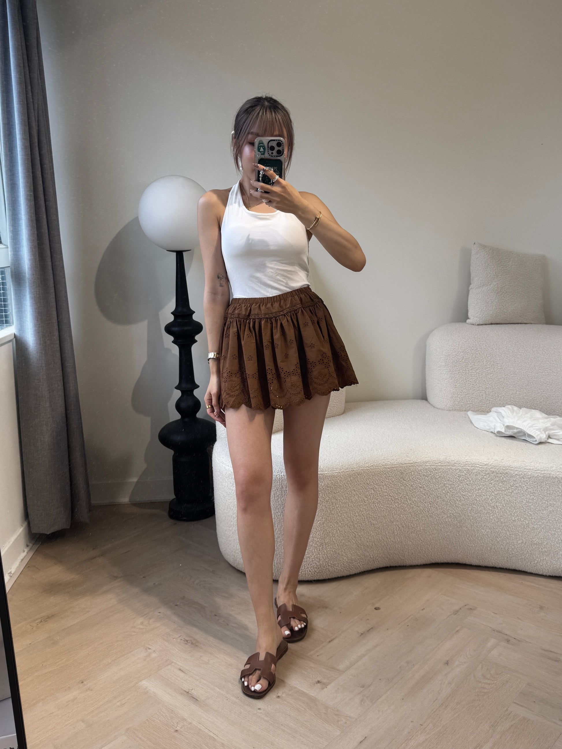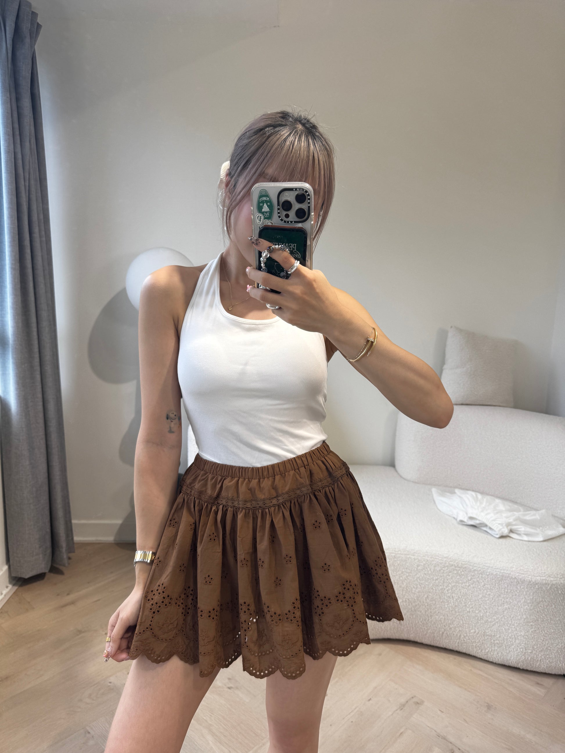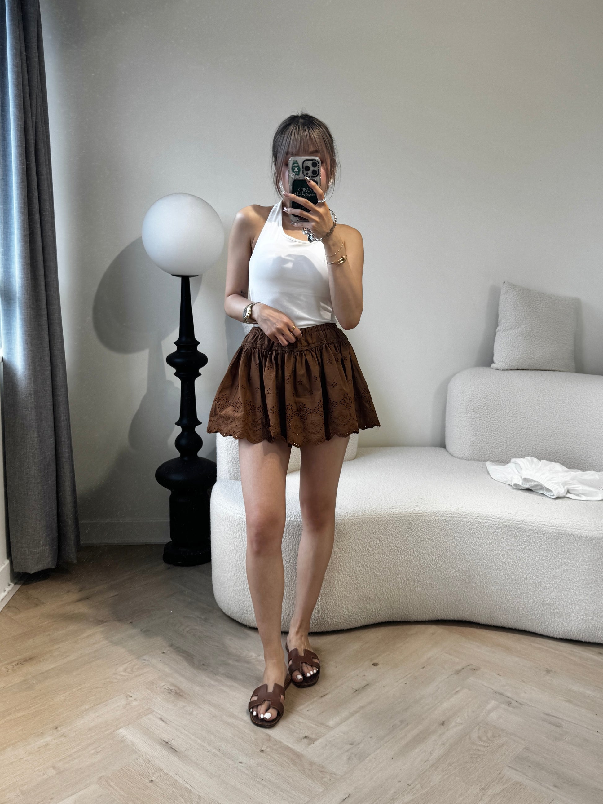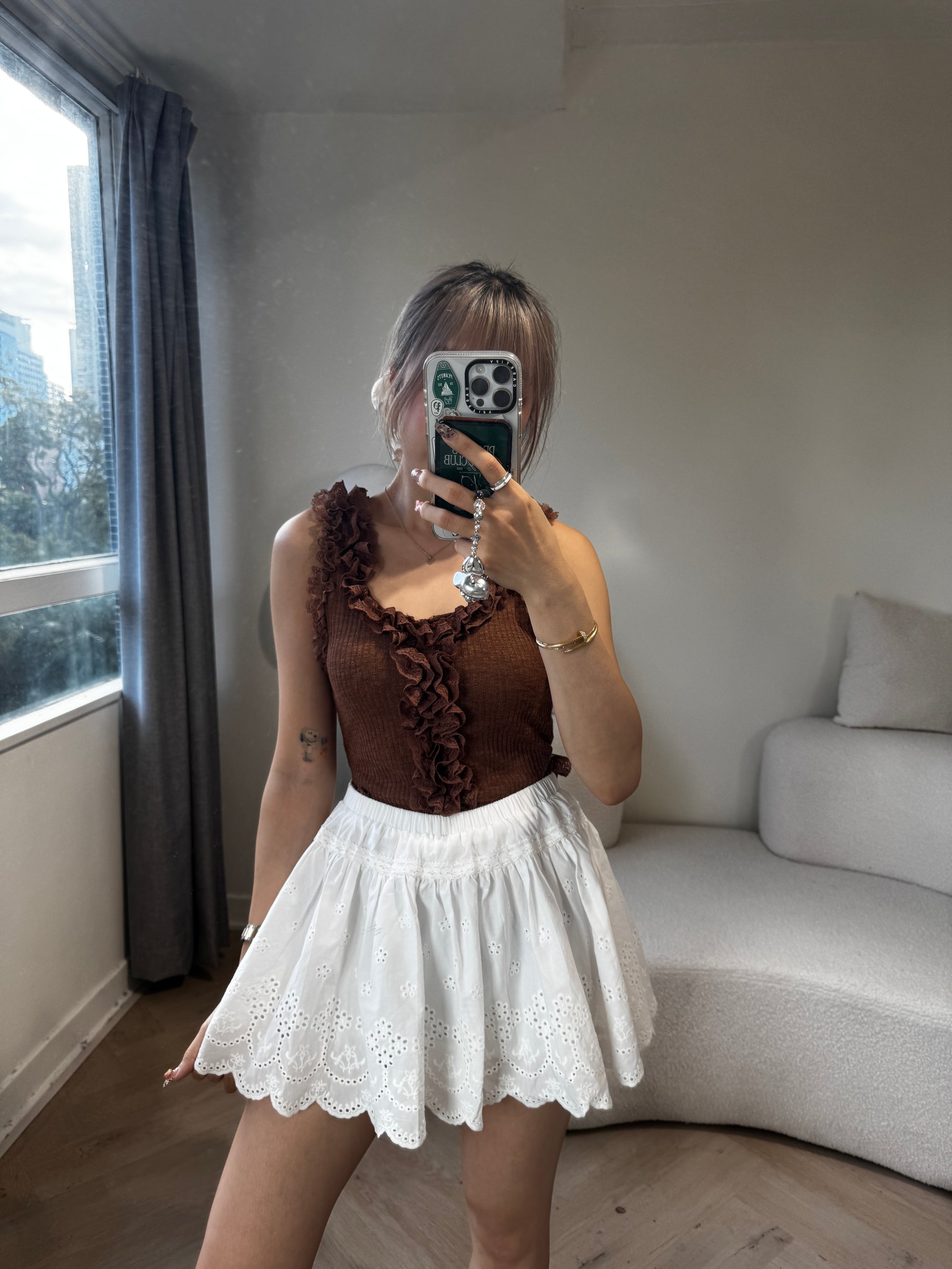 勾花波浪邊短裙 ( 白/啡 )
