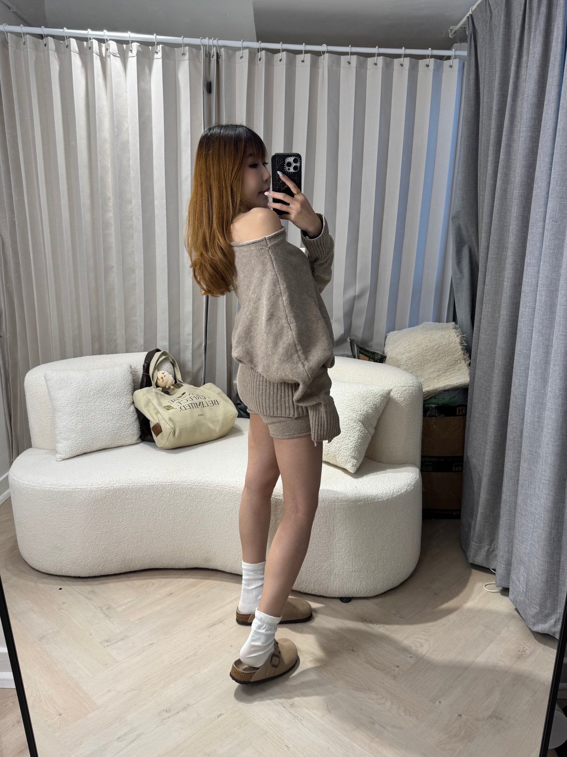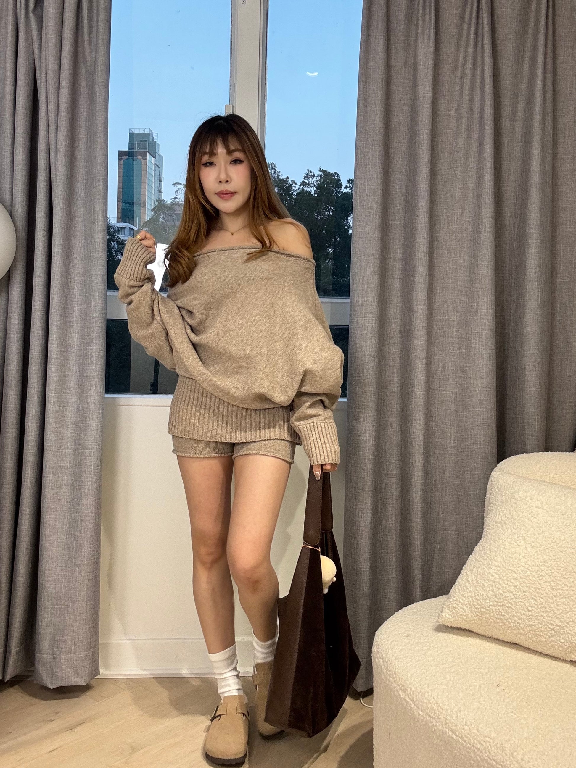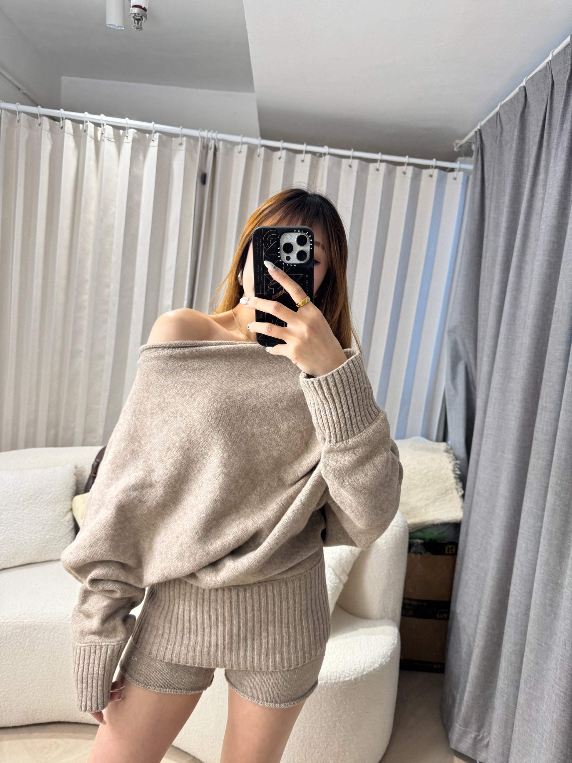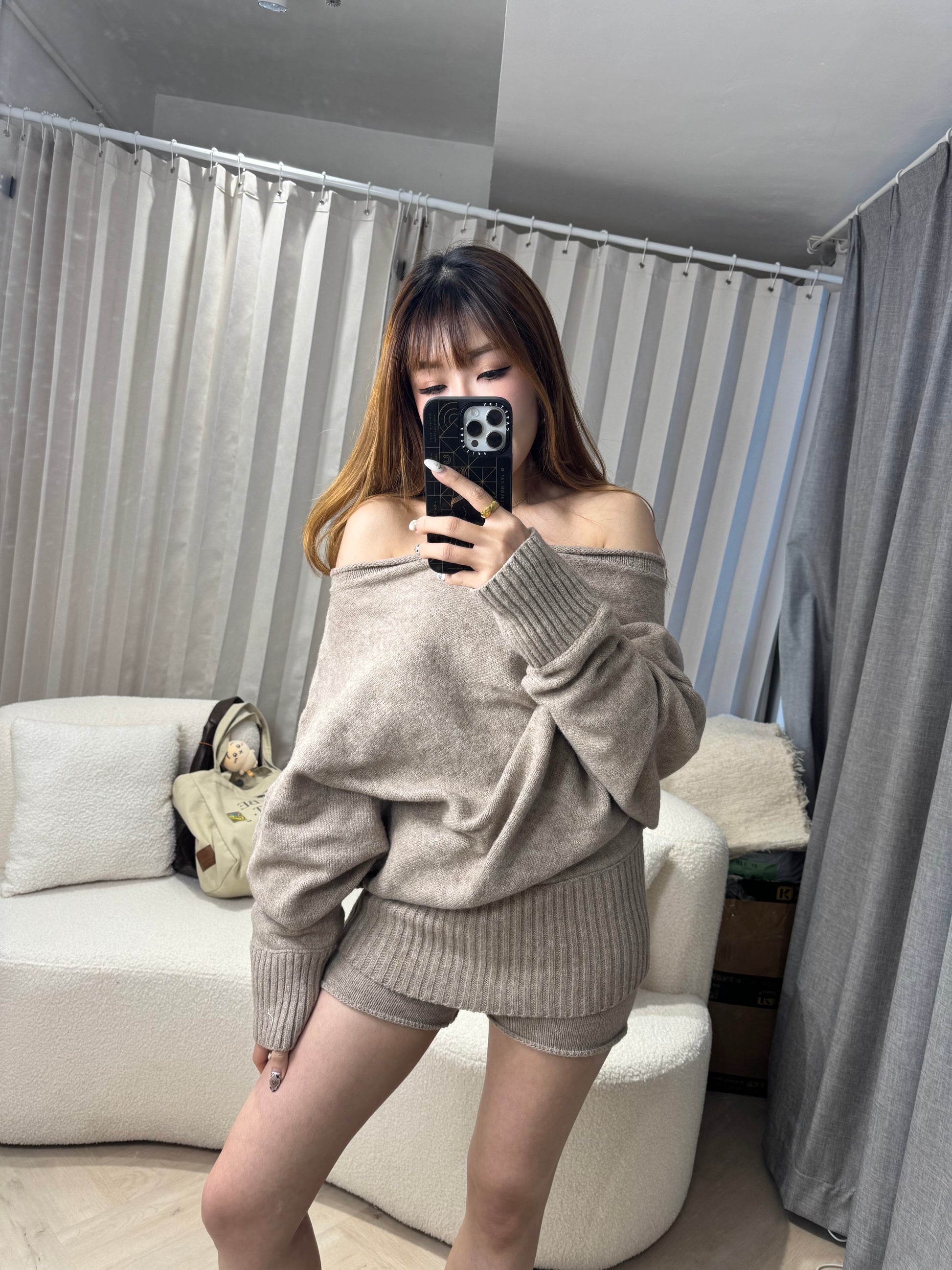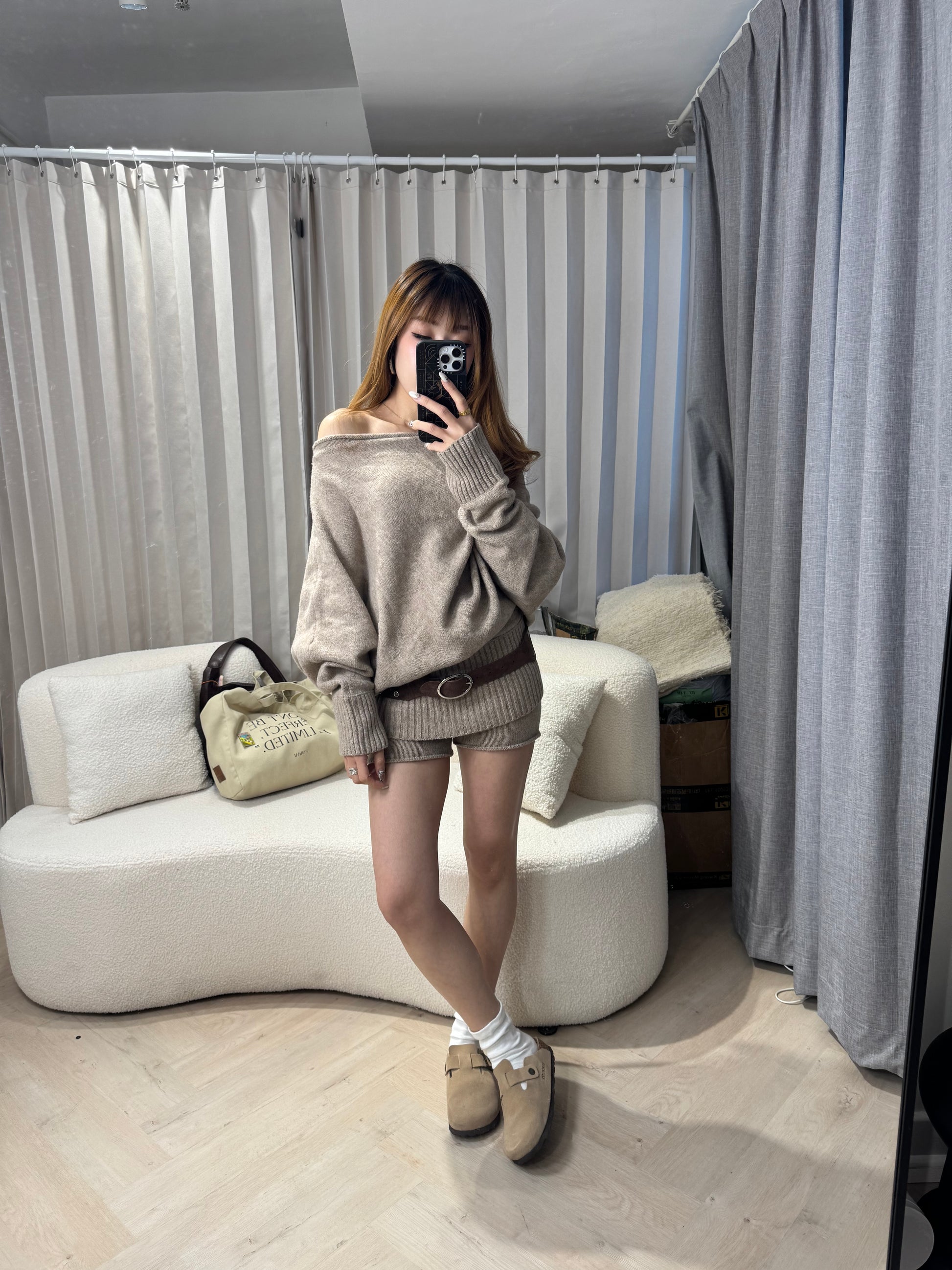泡泡領冷上衣+短褲套裝SET ( 灰/杏 )
