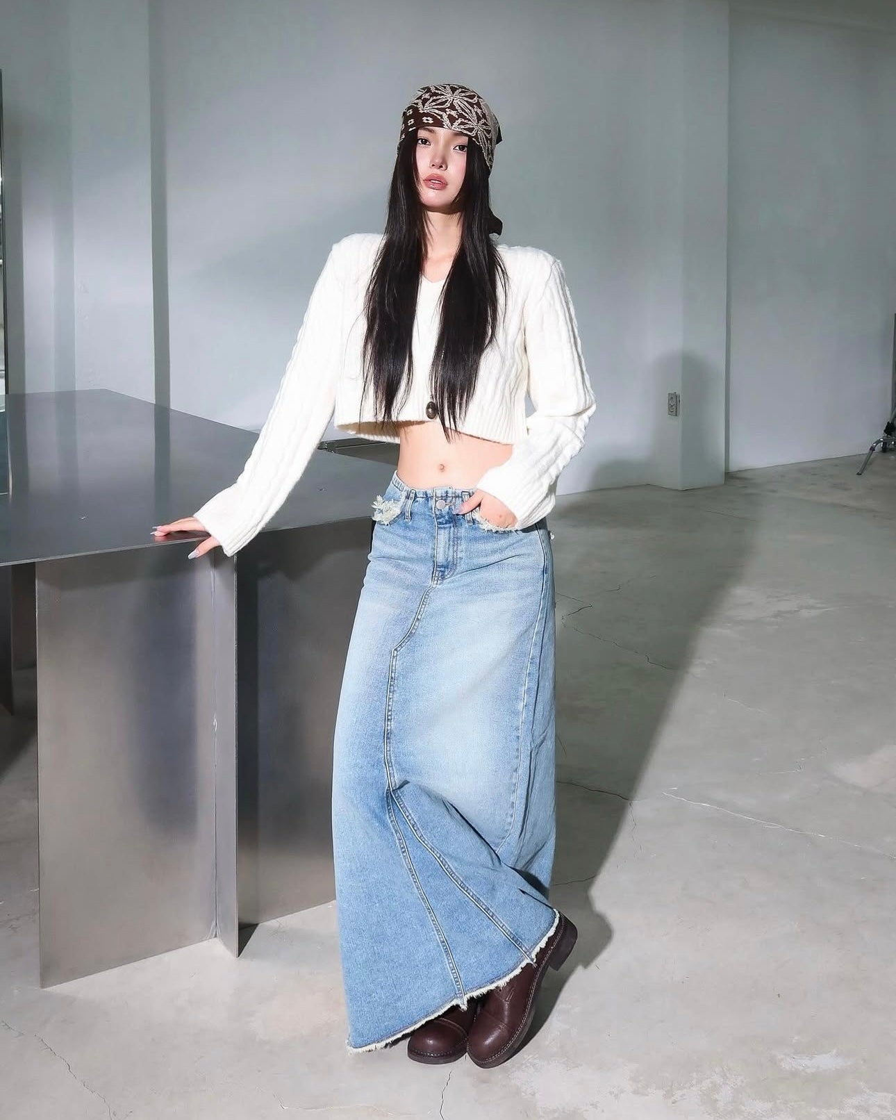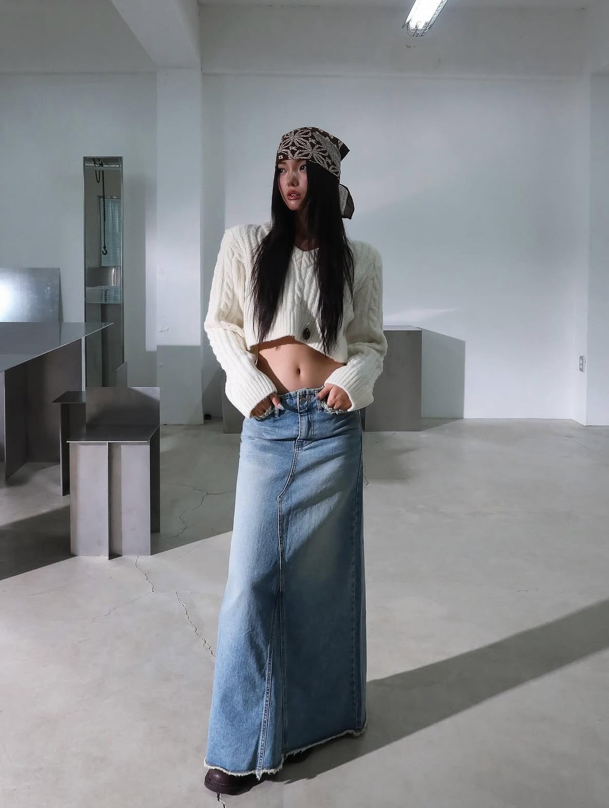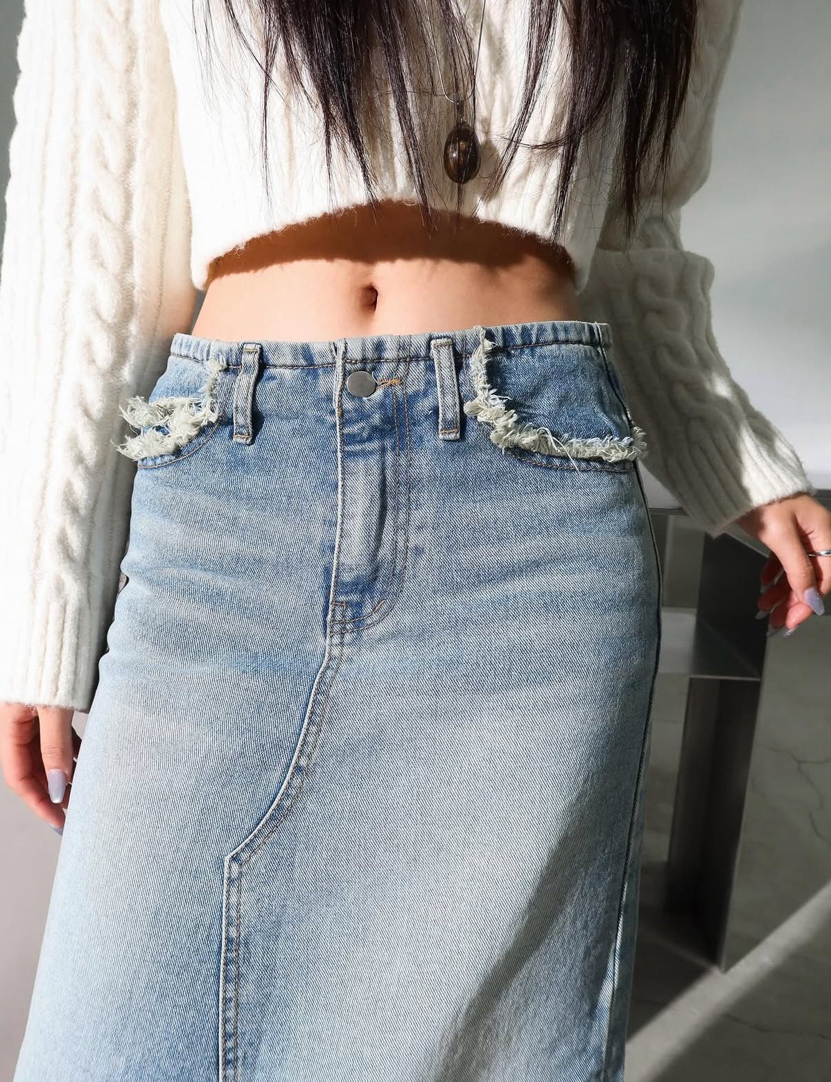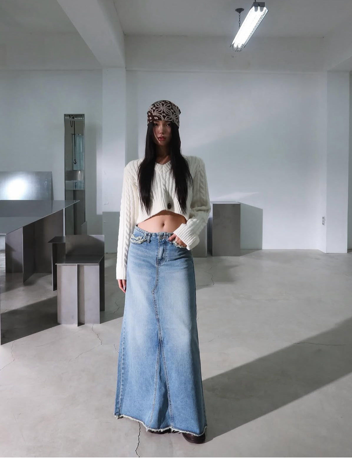洗水後開叉連腰繩牛仔長裙 ( S/M )