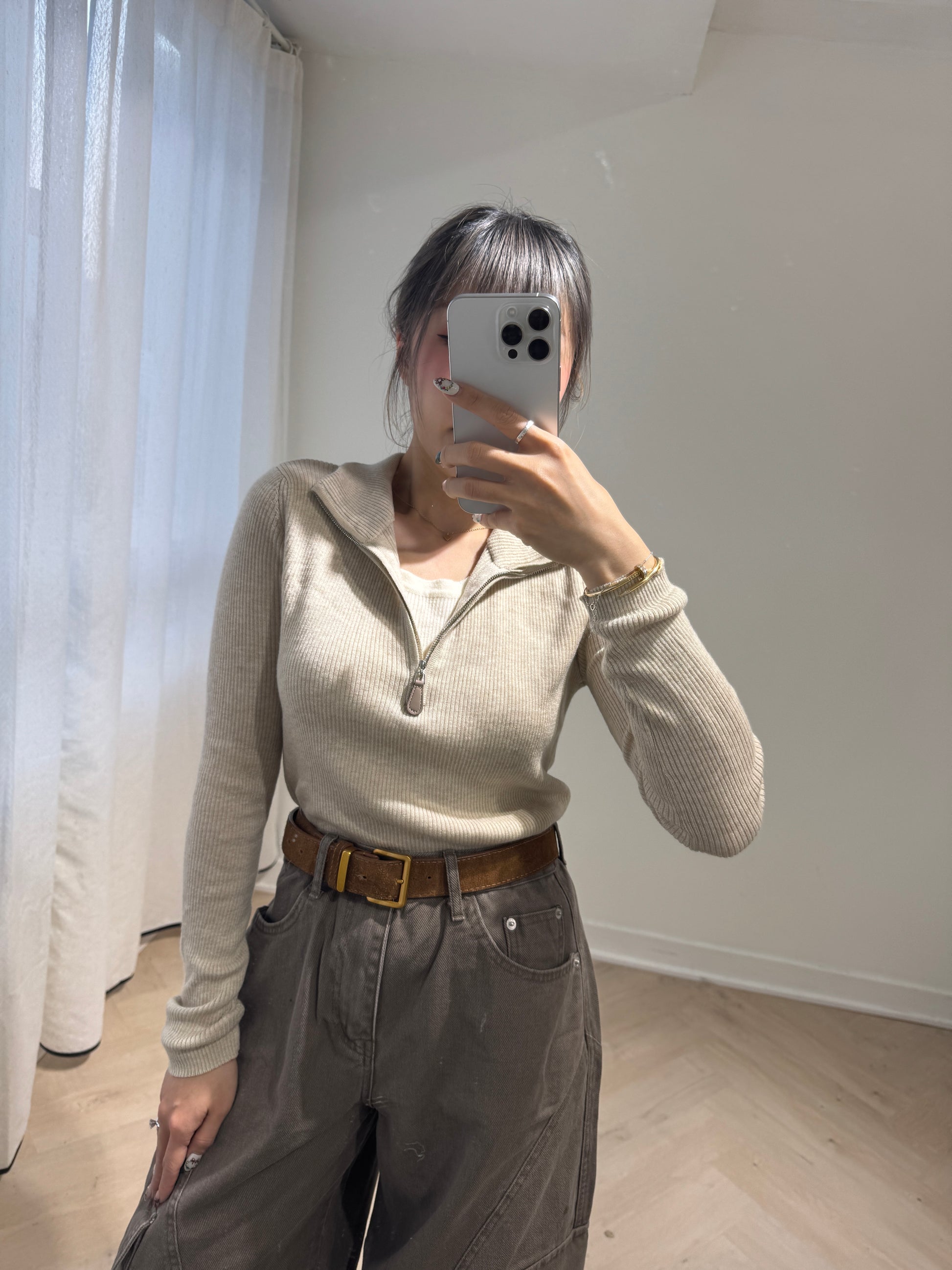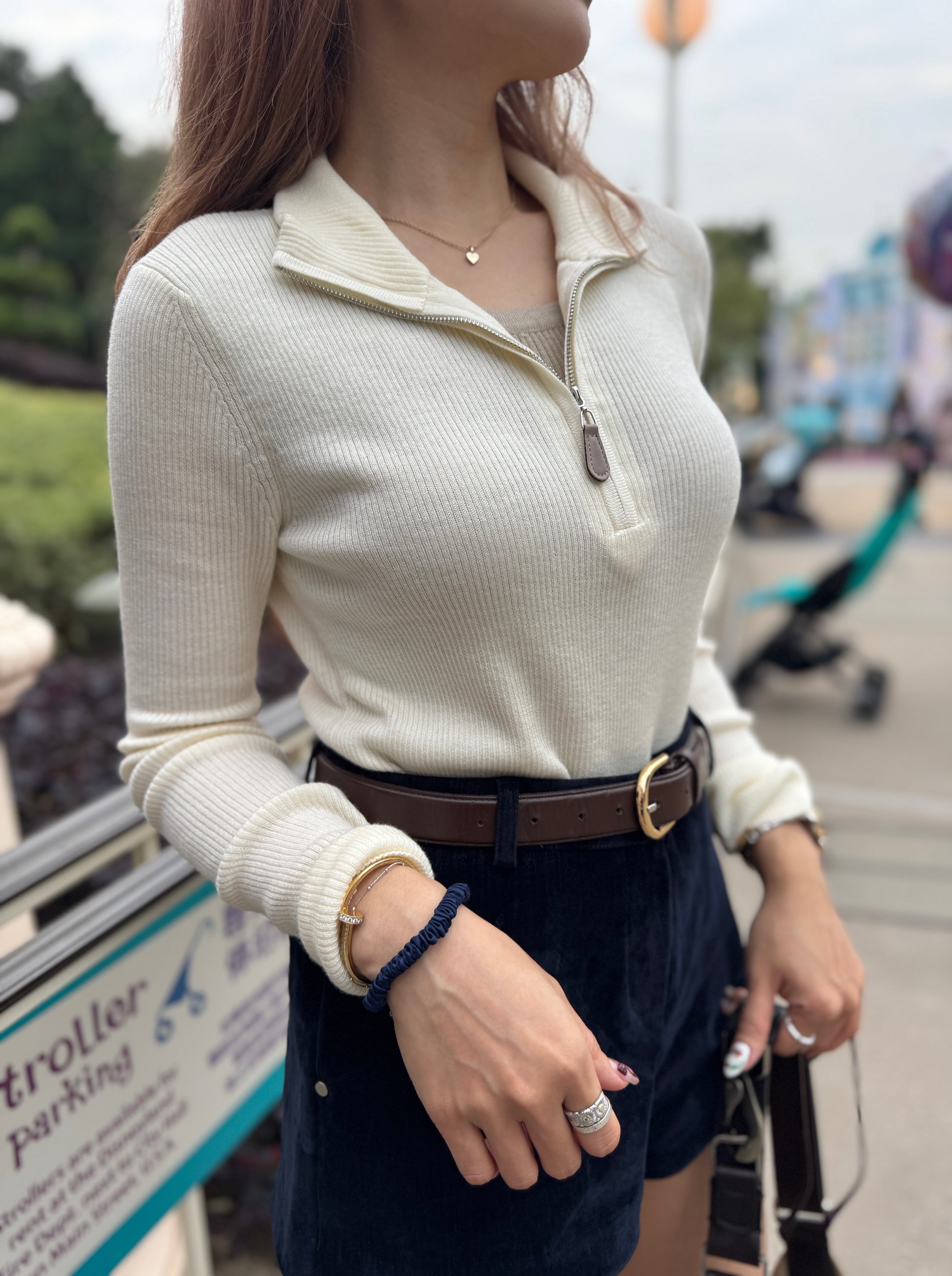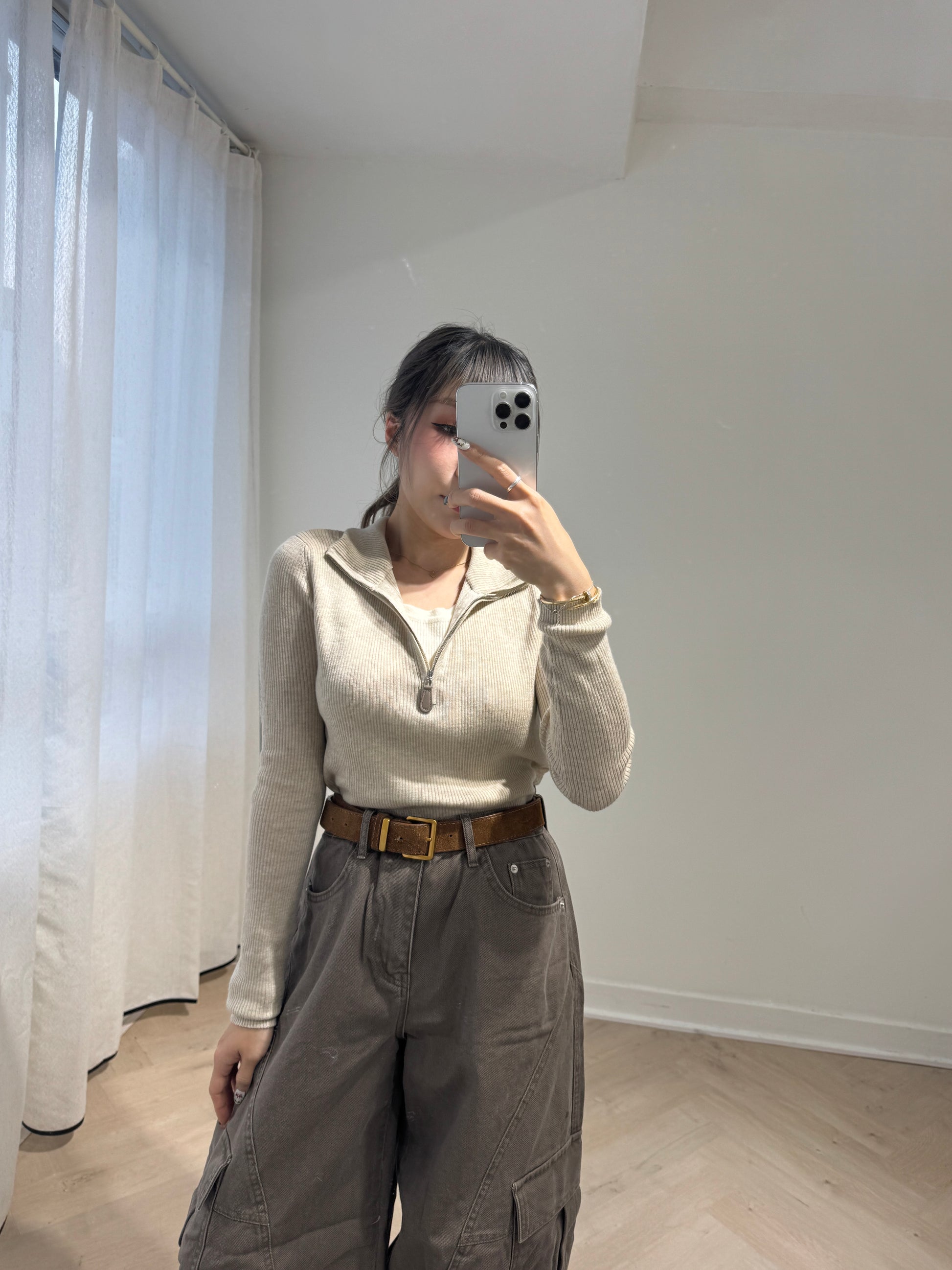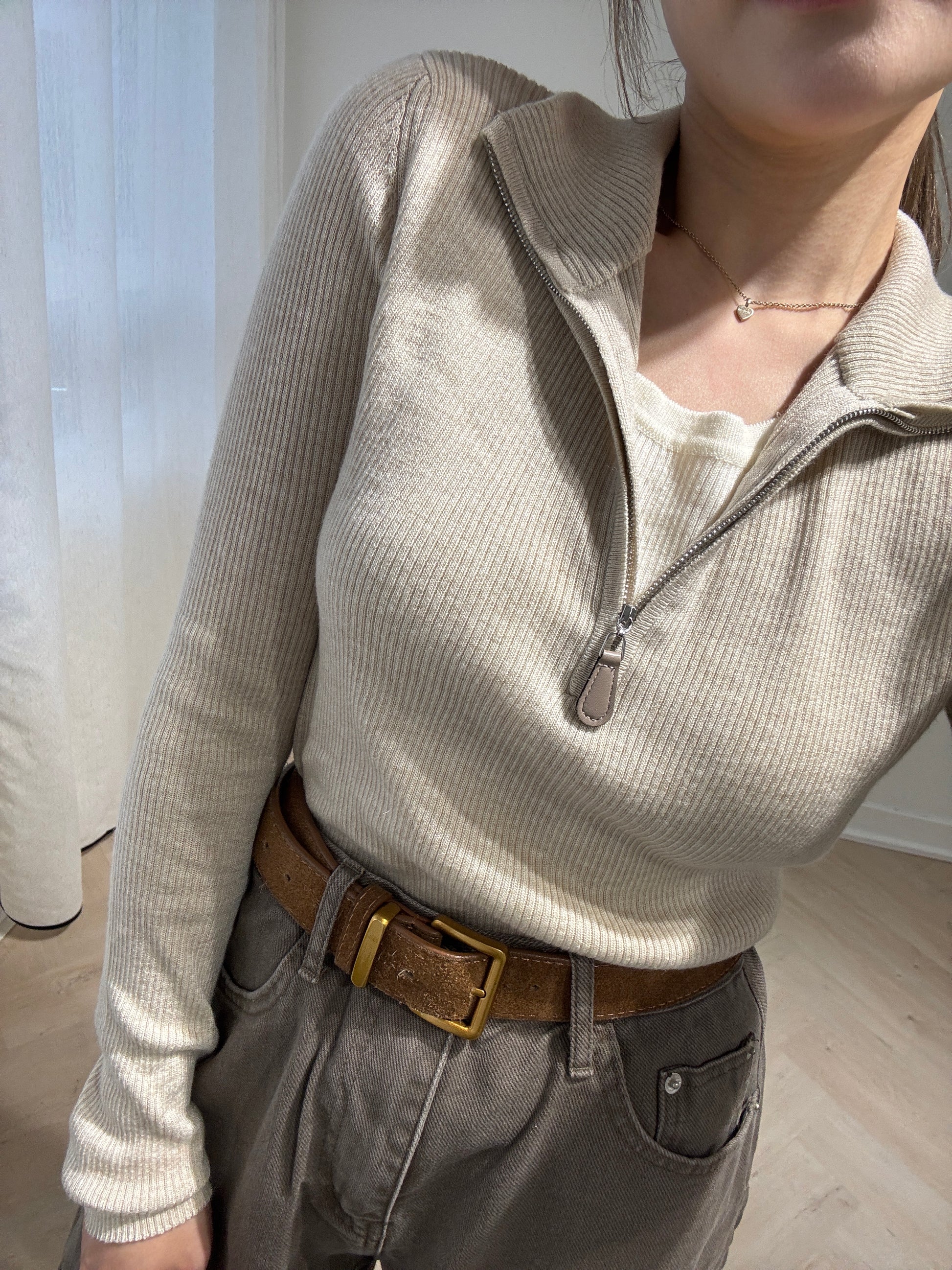 皮扣拉鍊假兩件上衣 ( 杏/米白 )