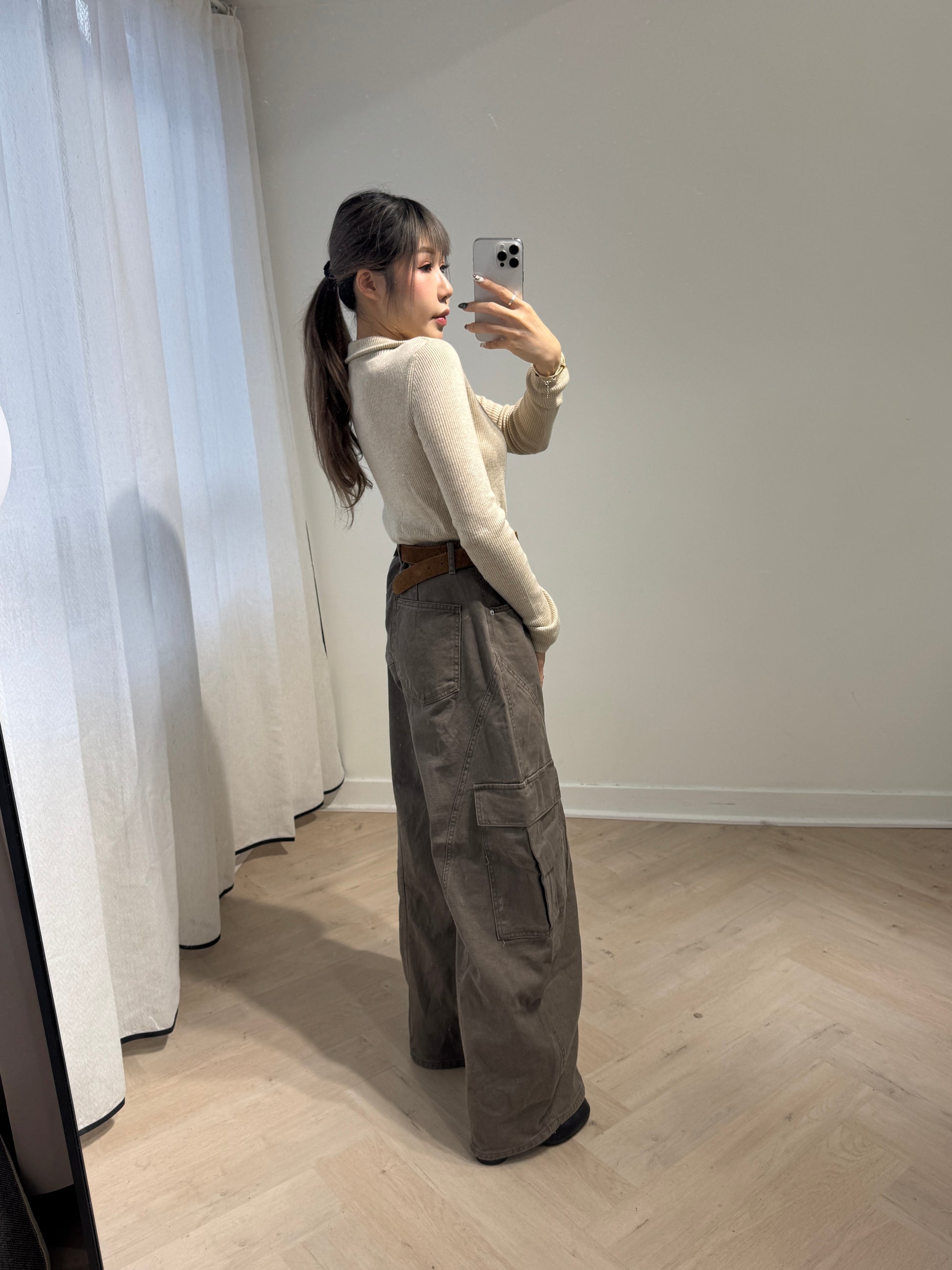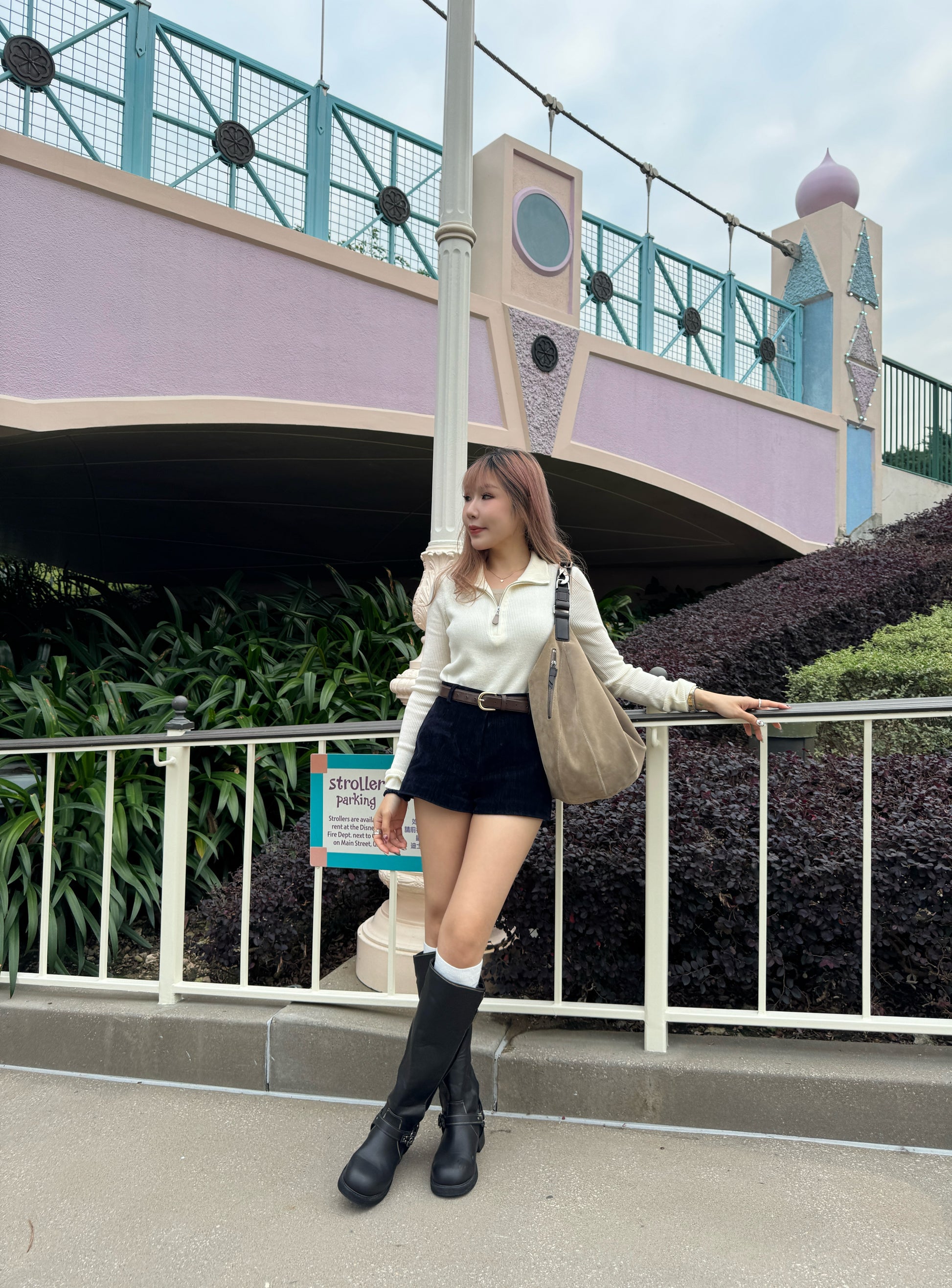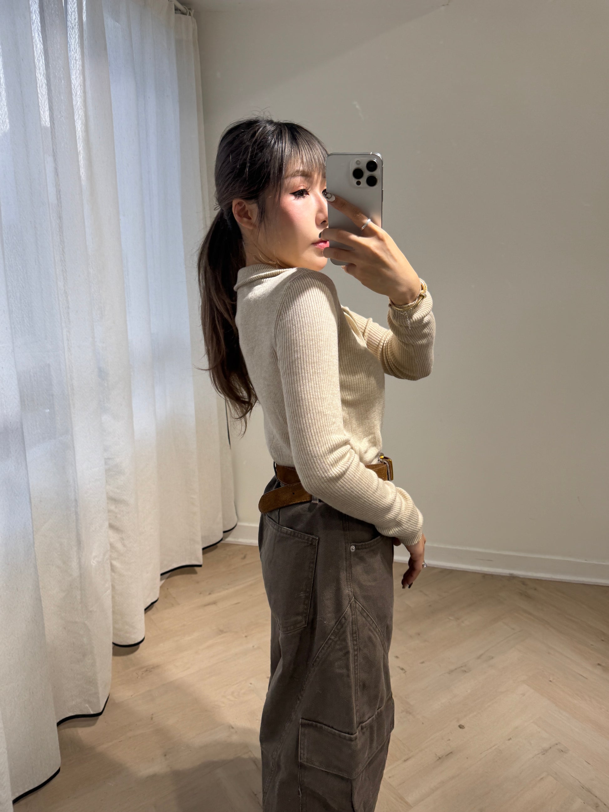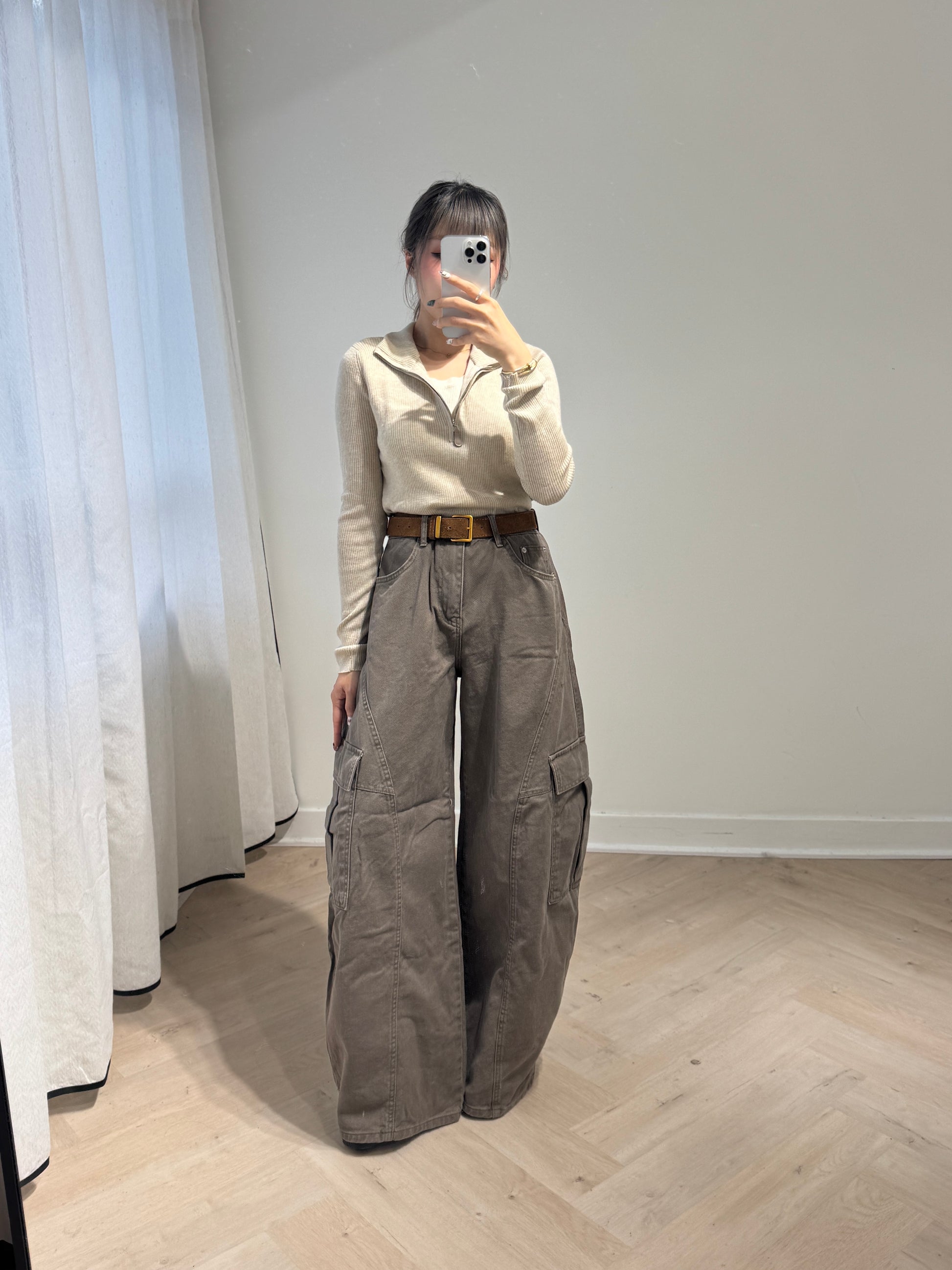 皮扣拉鍊假兩件上衣 ( 杏/米白 )