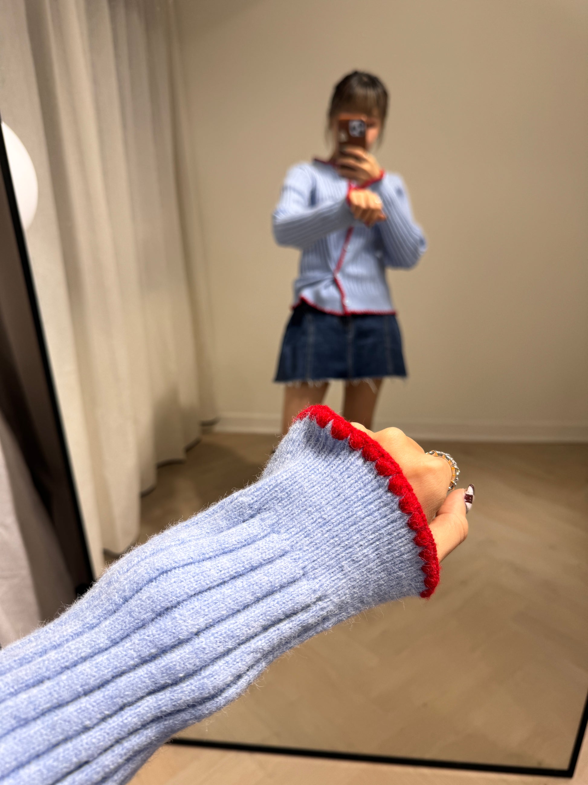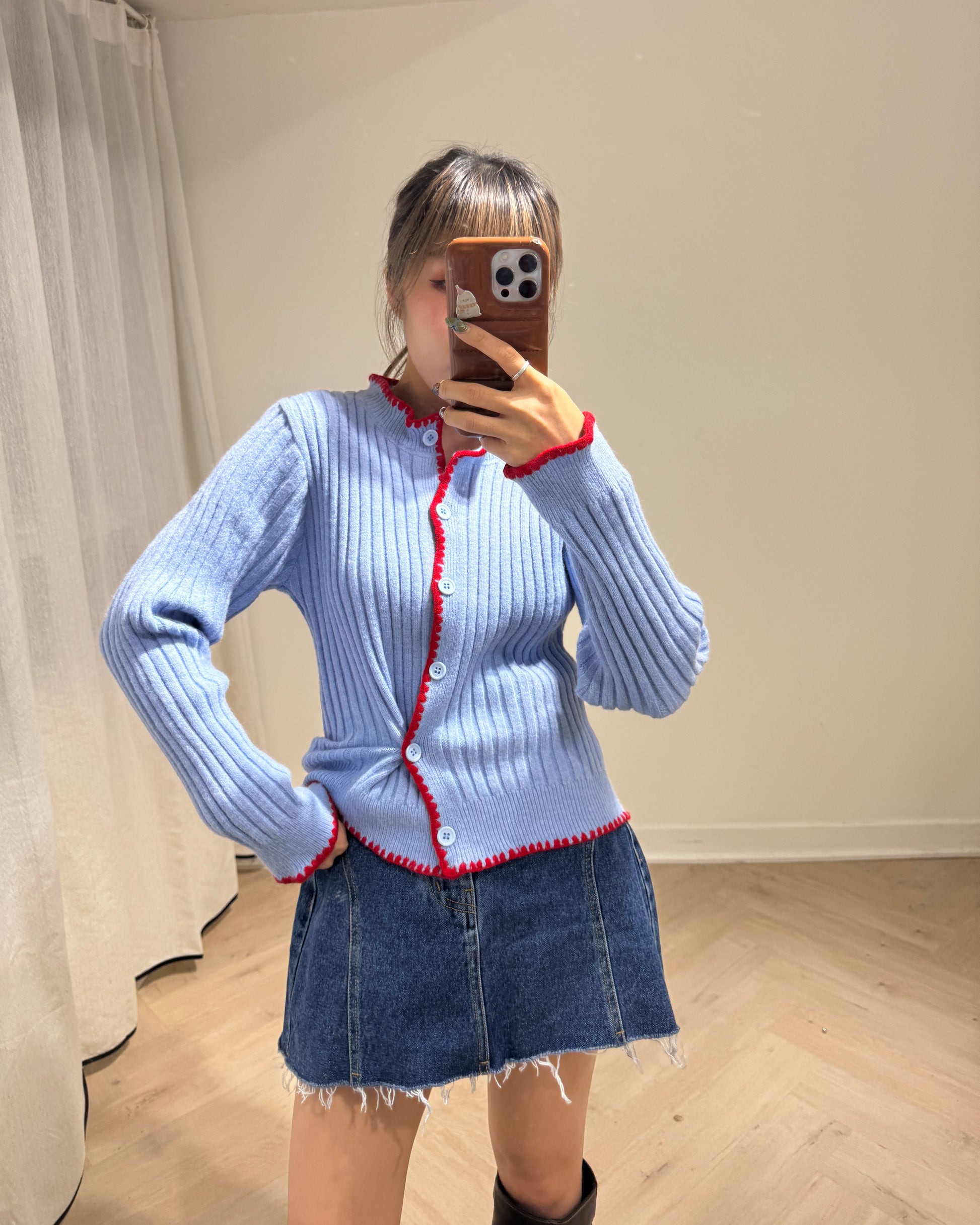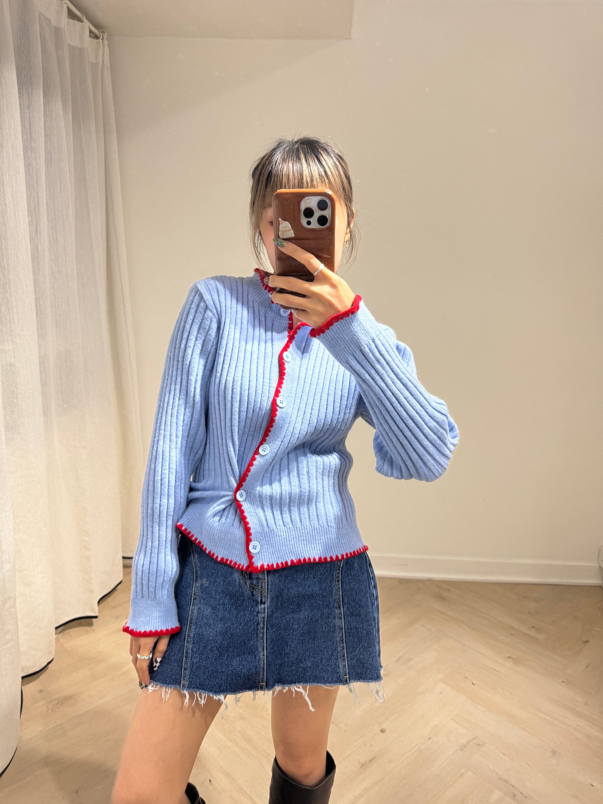 粉藍併紅邊側鈕扣上衣外套