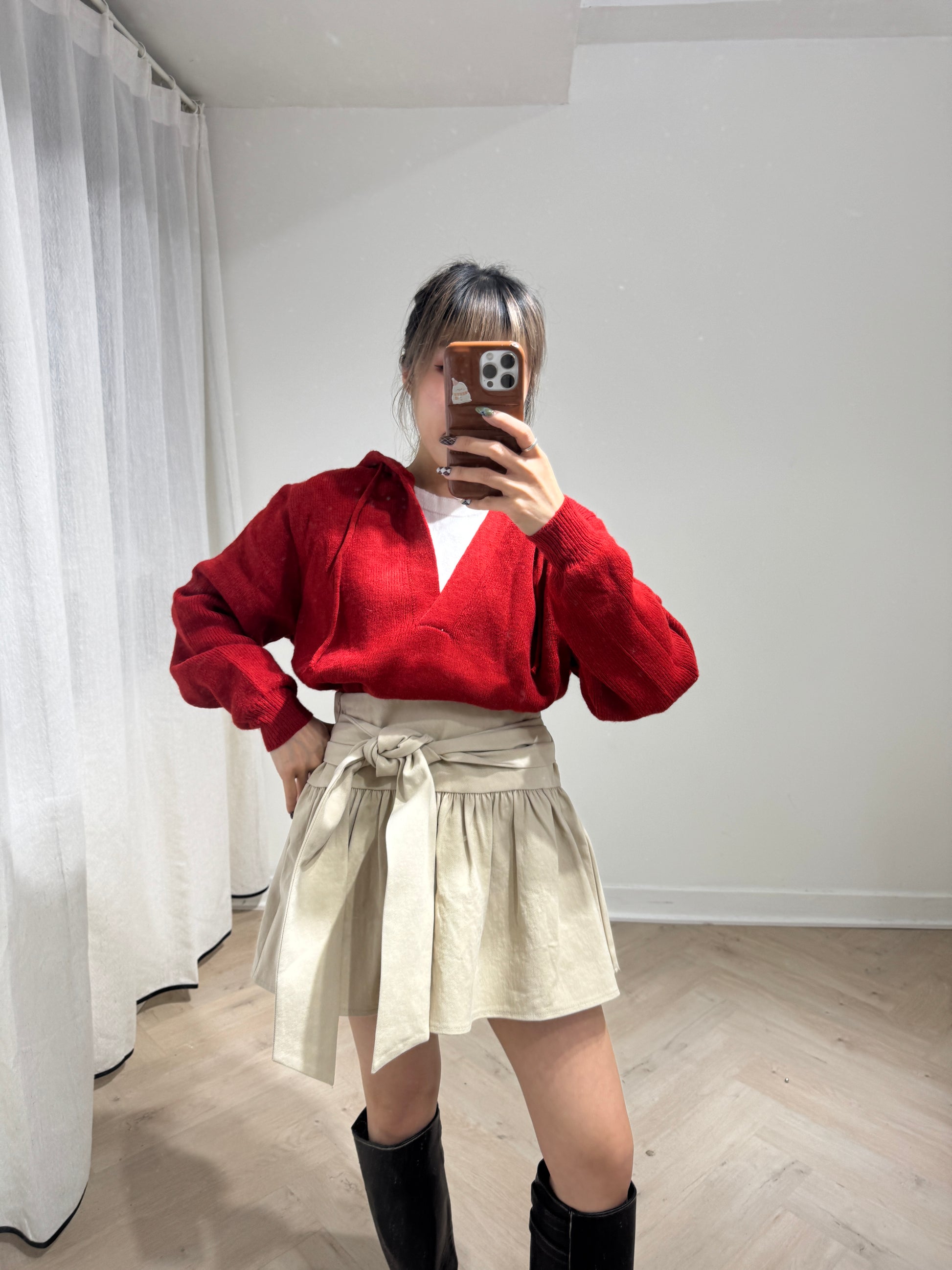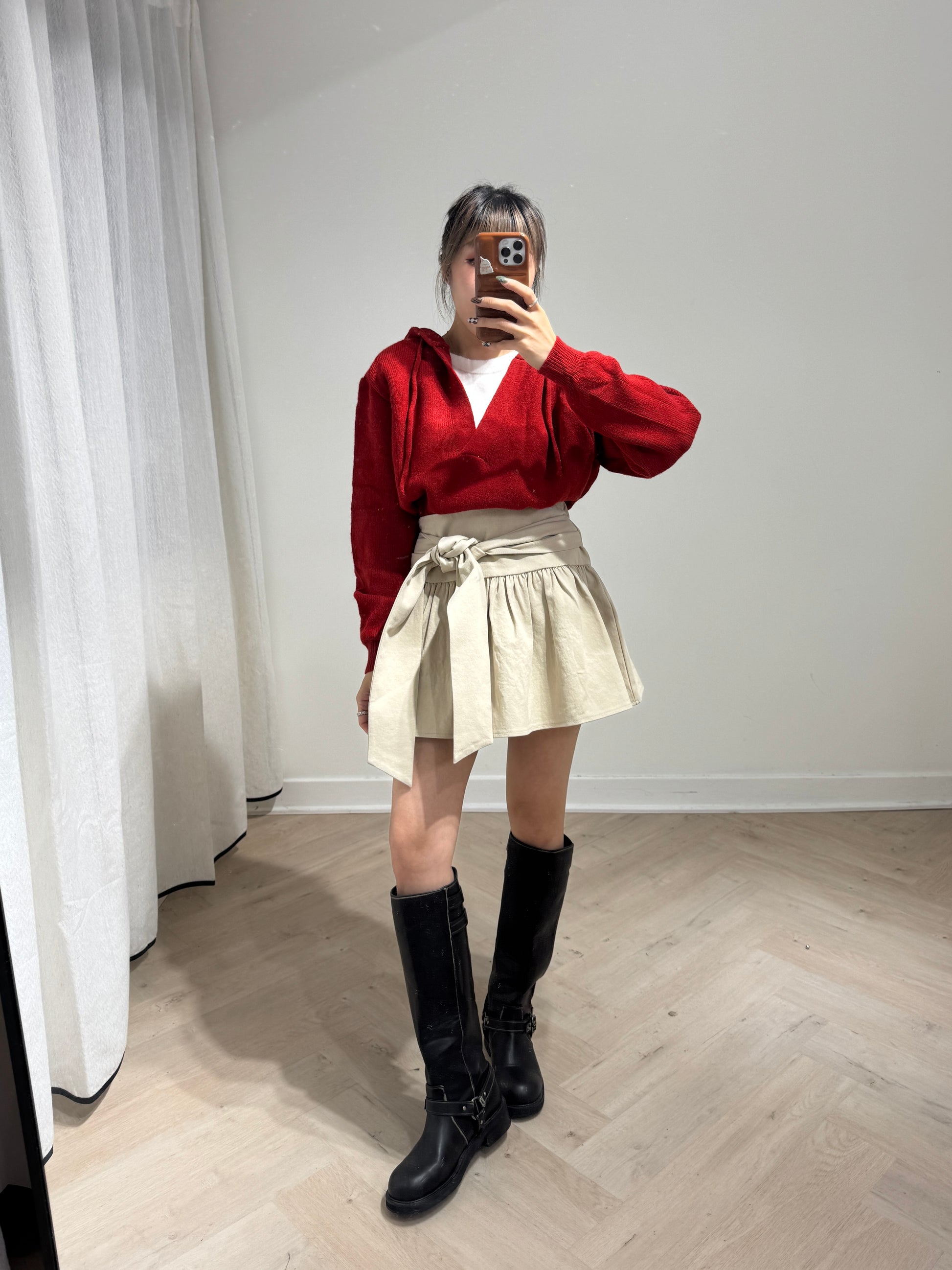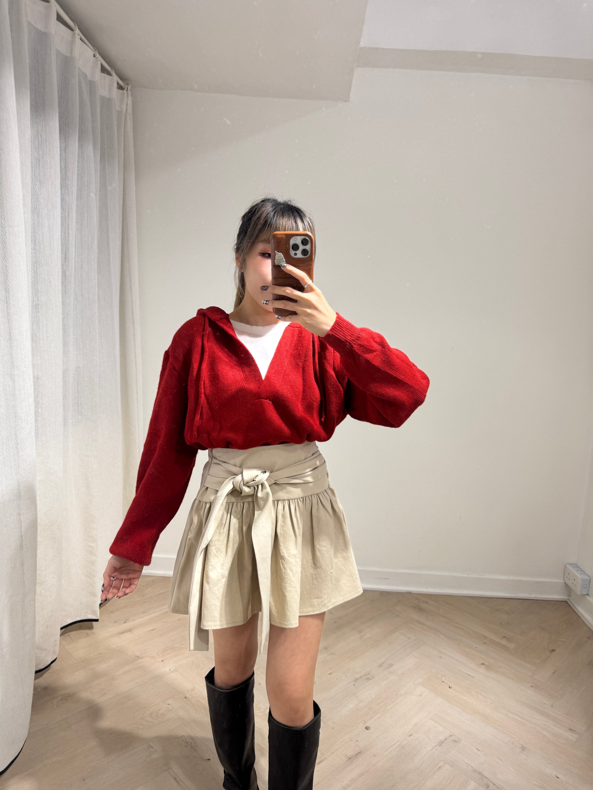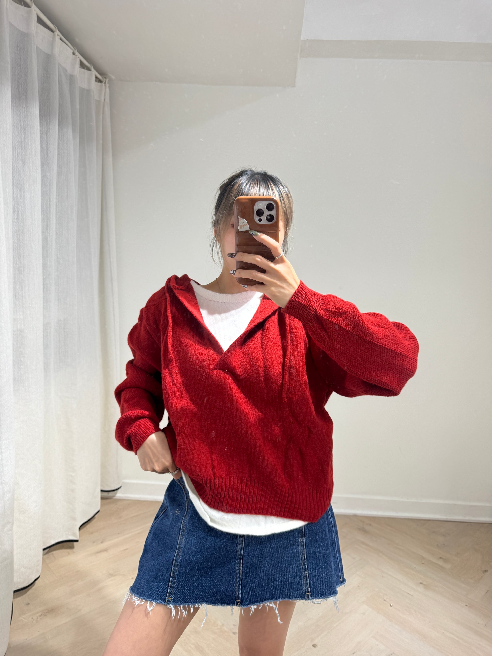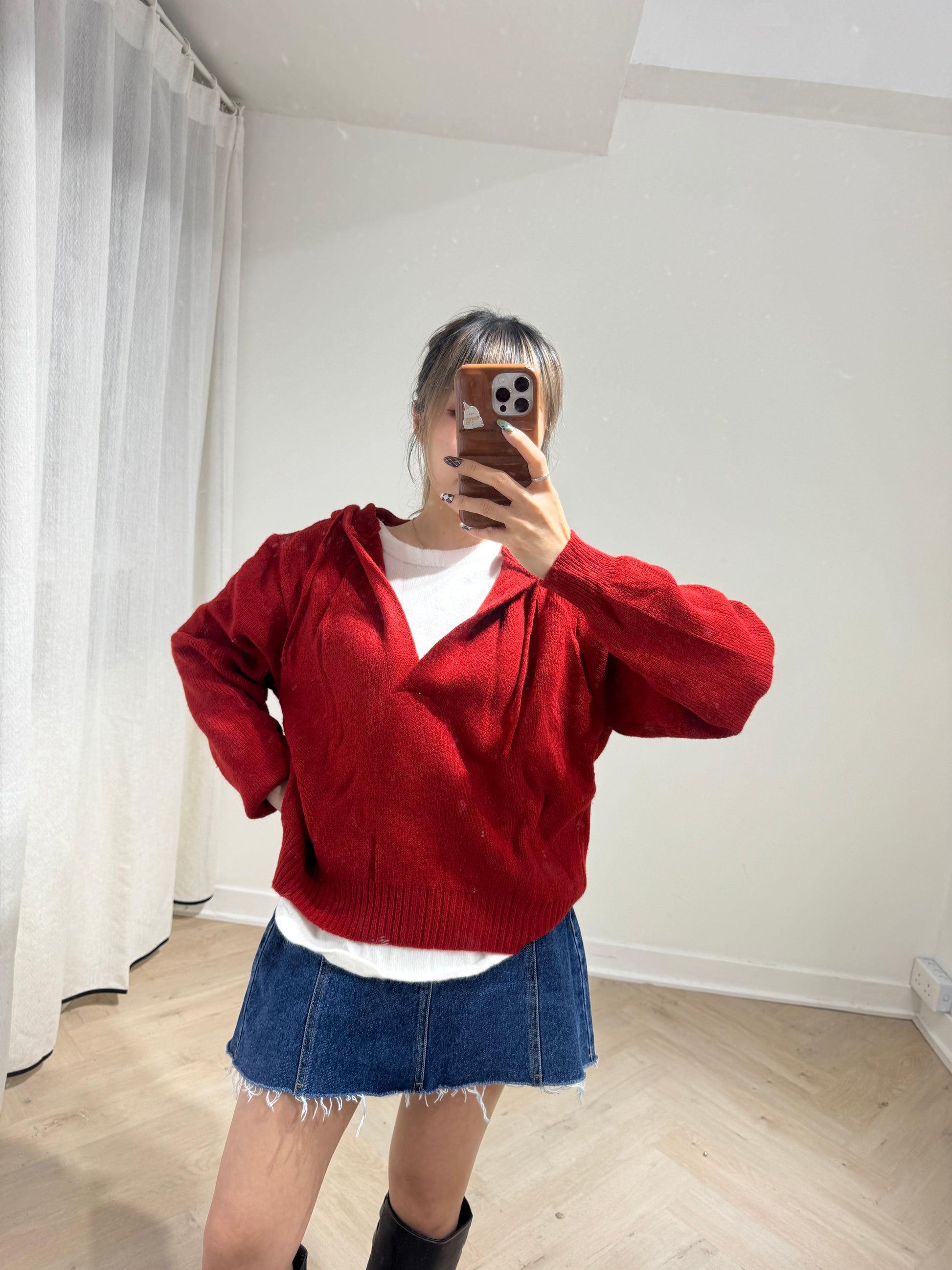紅色假兩件有帽上衣