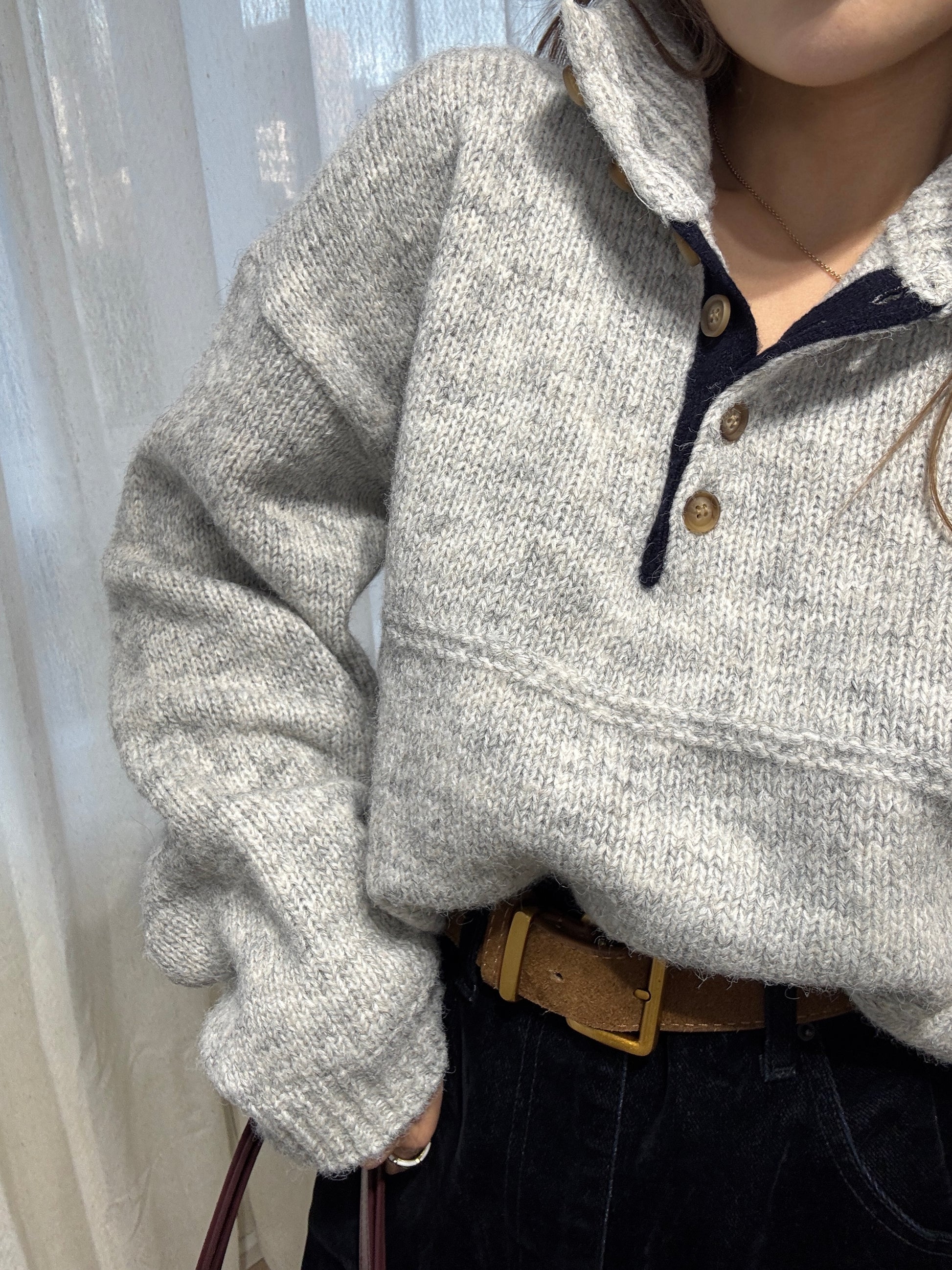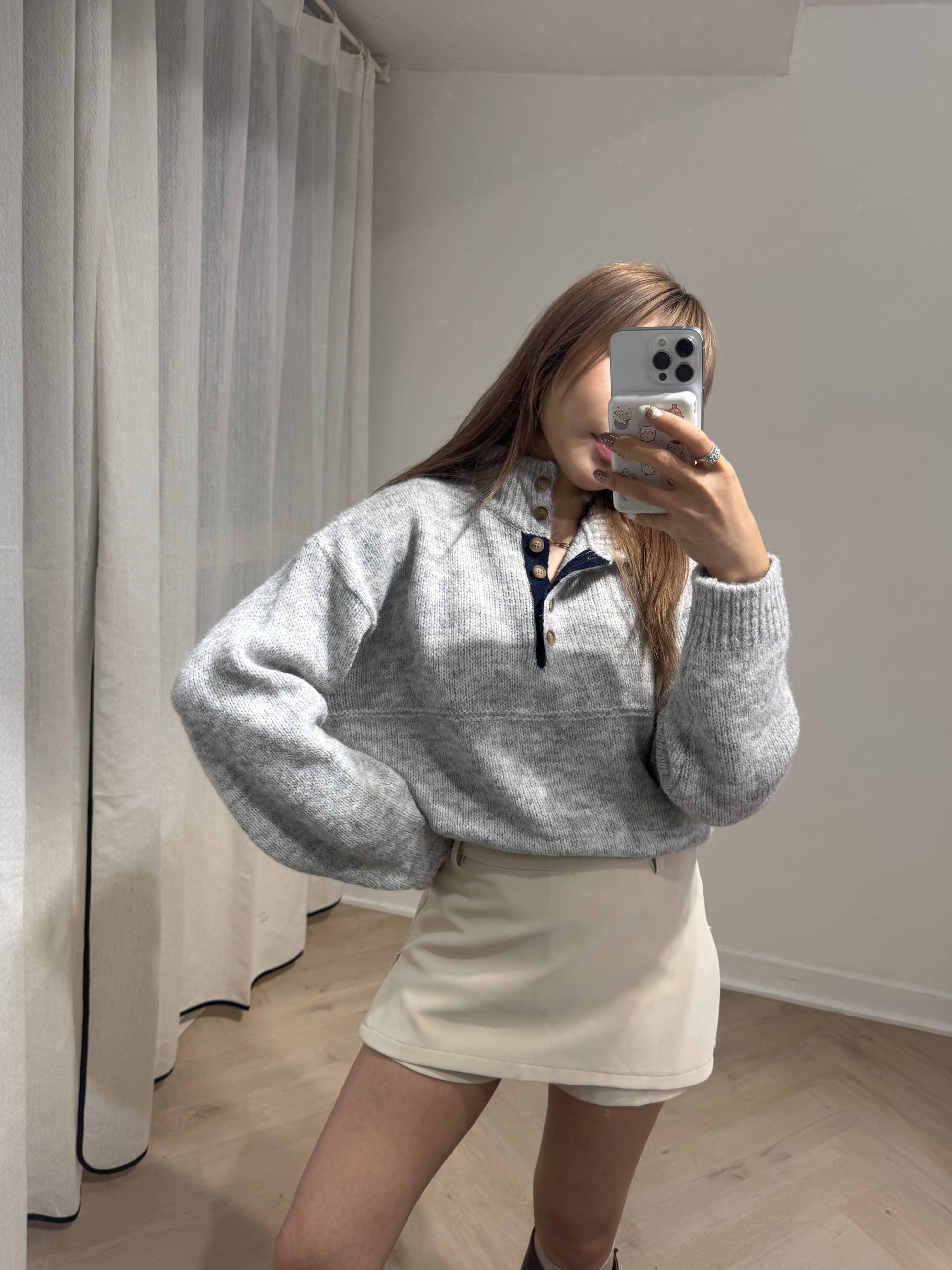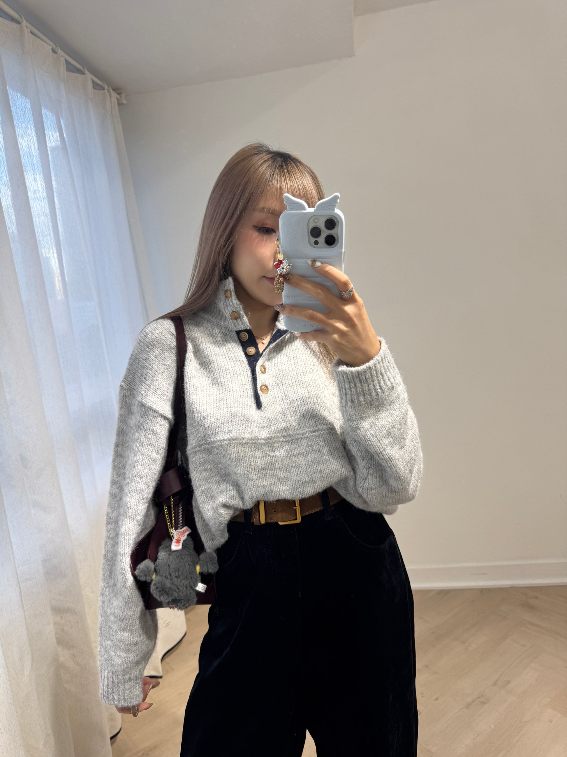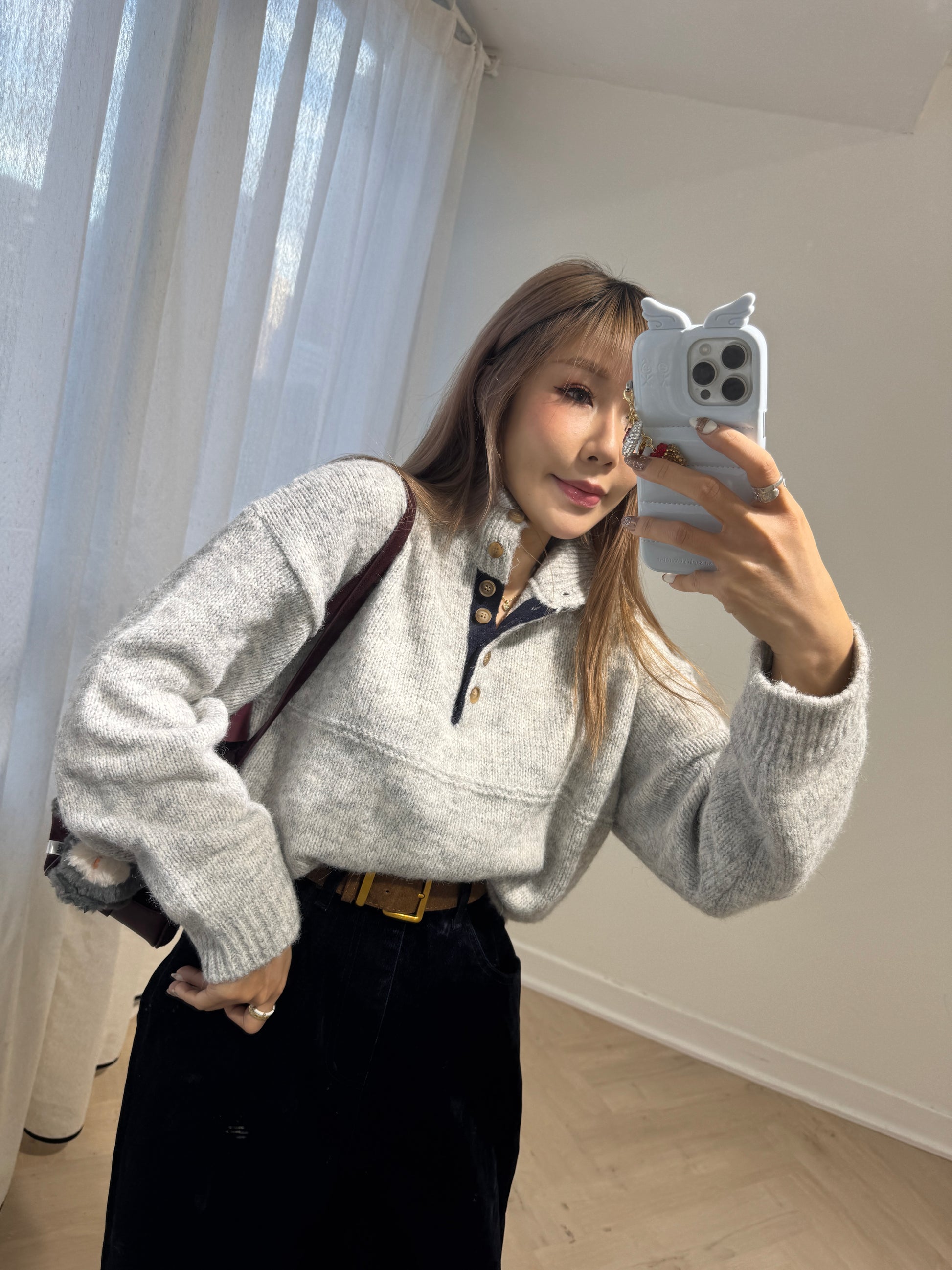 鈕扣企領混線冷衫 ( 米杏/淺灰 )