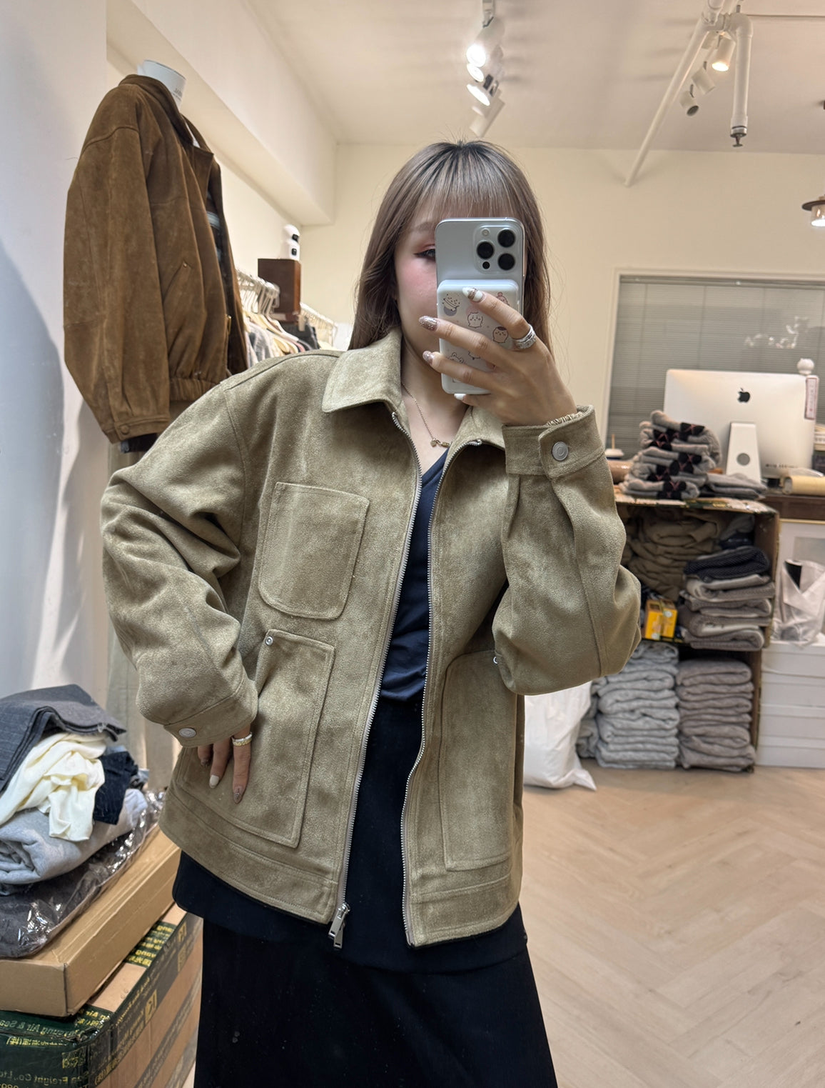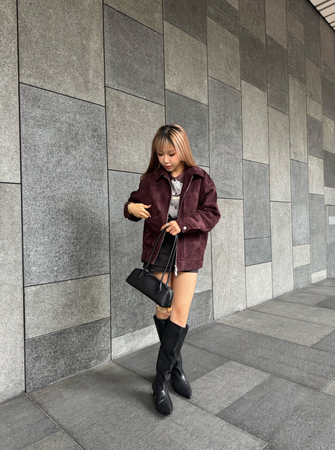麂布有領拉鍊外套 ( 酒紅/杏 )